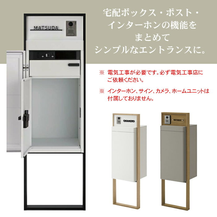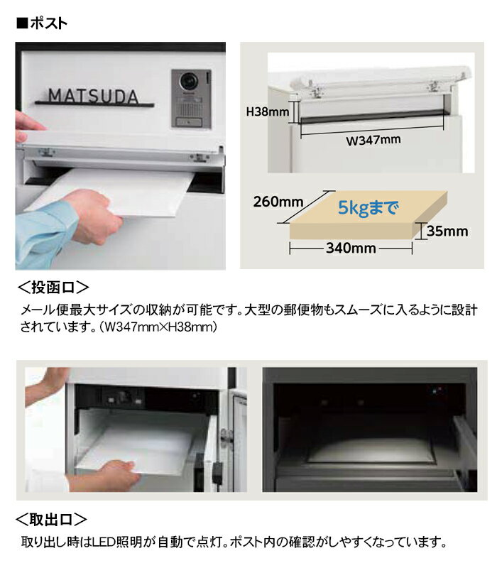 LIXIL スマート宅配ポストTA ファンクション仕様(カメラなし) ※ ホームユニット・カメラ・インターホン・サインは付属しておりません。※ 生鮮食料品、貴重品、現金等は受け取れません。※ 荷物の荷受け及び預けられた荷物等に関する事故に対しては責任を負いかねます。※ 故意、悪意によるいたずらに対する防御機能はありません。 ※ 施工の際の電気工事は、必ず電気工事店にご依頼ください。 ※同時に表札をご注文頂きます場合、スマート宅配ポストの納期は表札の納期により変動いたします。詳細はお問い合わせ下さいませ。 商品名 LIXIL スマート宅配ポストTA ファンクション仕様(カメラなし) 商品説明 電子錠・タッチパネルで充実機能の機能門柱。内扉は安心の常時施錠で大切なお荷物を守ります。 ポイント <ポスト> ●大型の郵便物もスムーズに入るよう設計。 ●W340mm×H260mm×厚み35mm(重さ5kgまで)受取可能。 ●取出し時はLED照明が自動で点灯。ポスト内の確認がしやすくなっています。 <宅配ボックス> ●2リットル6本入りペットボトルが2ケース収納可能。 ●460mm×330mm×340mm(重さ30kg)まで受取可能。 ●印鑑ホルダーも搭載。※印鑑は市販品をお求めください。 ●景観に馴染みやすい豊富なカラーから選べます。 ご注意ください ※生鮮食料品、貴重品、現金などは受け取れません。 ※配達荷物の受け渡しについては責任を負いかねます。 ※お子様が宅配ボックス内に入って遊ばないよう、ご注意ください。 ※台風など風の強いときは、前扉が開かないように縛る等してください。しない場合、前扉が風にあおられ破損するおそれがあります。 ※本製品にはマグネットが使用されており、医療用ペースメーカーをお使いの方が本製品をご使用される場合は、 医療用ペースメーカーの取扱説明書および担当医師の指示に従ってください。 ※ホームネットワークシステムに連動しない場合、荷物の受取は、1度に1回の配達分となるため、早めに荷物を取り出すことをおすすめします。 ※スマート宅配ポストとの電源線は単独(専用回路)で接続してください。EEスイッチ等の自動で「入・切」するものに接続させないでください。日中に使用できなくなります。 ※扉を開けている最中は、強風にあおられて扉が限界以上に開かないようにご注意ください。扉が限界以上に開くと変形し開閉に支障を きたすおそれがあります。 ※宅配ボックスを初めて使用する場合、宅配業者様へ不在時における宅配ボックス利用の意思をお伝えください。お伝えしないと、業者によって入れていただけないことがあります。 ※本体の形状によっては天面に水が溜まることがあります。取出しの際に濡れないようご注意ください。