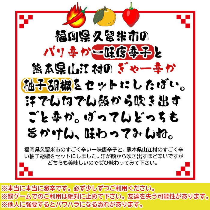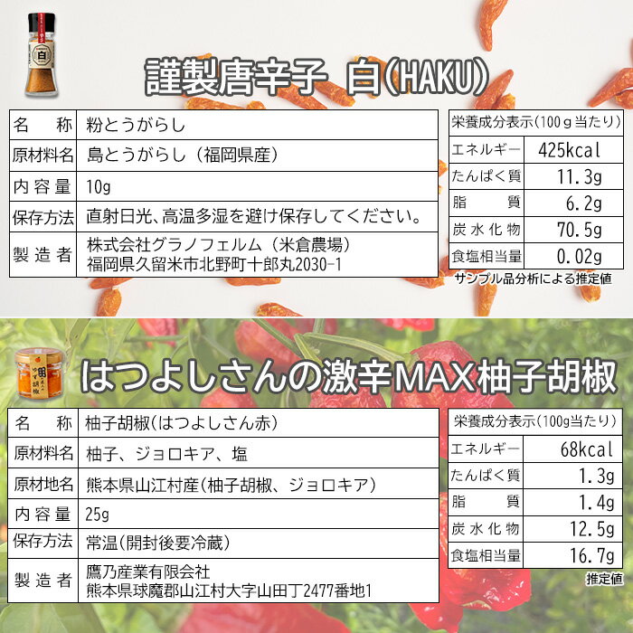 【謹製一味唐辛子 白 HAKU】 有吉ゼミ 激辛チャレンジグルメにご紹介いただきました。 超激辛 一味唐辛子 島唐辛子の抜群の風味 かけすぎ注意 本当に旨いので思わずかけ過ぎます。でも超激辛です。 罰ゲームのご利用禁止。洒落にならないくらい辛いです。 激辛が苦手な方に強要しないで下さい。パワハラになる可能性がございます。 南国でしか育たないと言われた島唐辛子。 福岡県産島唐辛子を、唐辛子の最も辛い部分もそのまま残して一味にしました。 瓶の出し口が大きいので、少しずつ傾けながらトントンとかけてください。 南国の「島唐辛子」福岡で作れんかと試行錯誤ばして育て一味にしてみたと。 バリ辛か!風味バリよか!味もバリ旨か! なんでんかけて美味しかけん、試してもらいたか。 【はつよしさんのジョロキア激辛MAX柚子胡椒】 熊本県山江村産の柚子とブートジョロキア使用。 唐辛子は部位により辛味が異なります。ジョロキアの辛味成分をこれでもかと加えて作ったゆず胡椒。 柚子とジョロキアの風味を先に感じますが、時間差でジョロキアの超激辛がガツンと来ます。 爪楊枝の先に付け、ご利用分だけを少しずつ伸ばしてご利用することをオススメします。 おでんや肉等に少し付けたり、柚子胡椒なので汁物も一気に広がりません。丼の隅に付けて少しずつご利用ください。 わさびと違って、醤油に溶かしても風味や味が飛びませんので、醤油に少し溶かしてご利用頂くのもオススメです。 福岡県久留米市のバリ辛か一味唐辛子と、熊本県山江村のぎゃー辛か柚子胡椒をセットにしたばい。 汗でん何でん顔から吹き出すごと辛か。ばってんどっちも旨かけん、味わってみんね。謹製唐辛子 白(HAKU) はつよしさんの激辛MAX柚子胡椒 辛み調味料一覧 クリックで一覧へ *辛度はスタッフの感覚です。