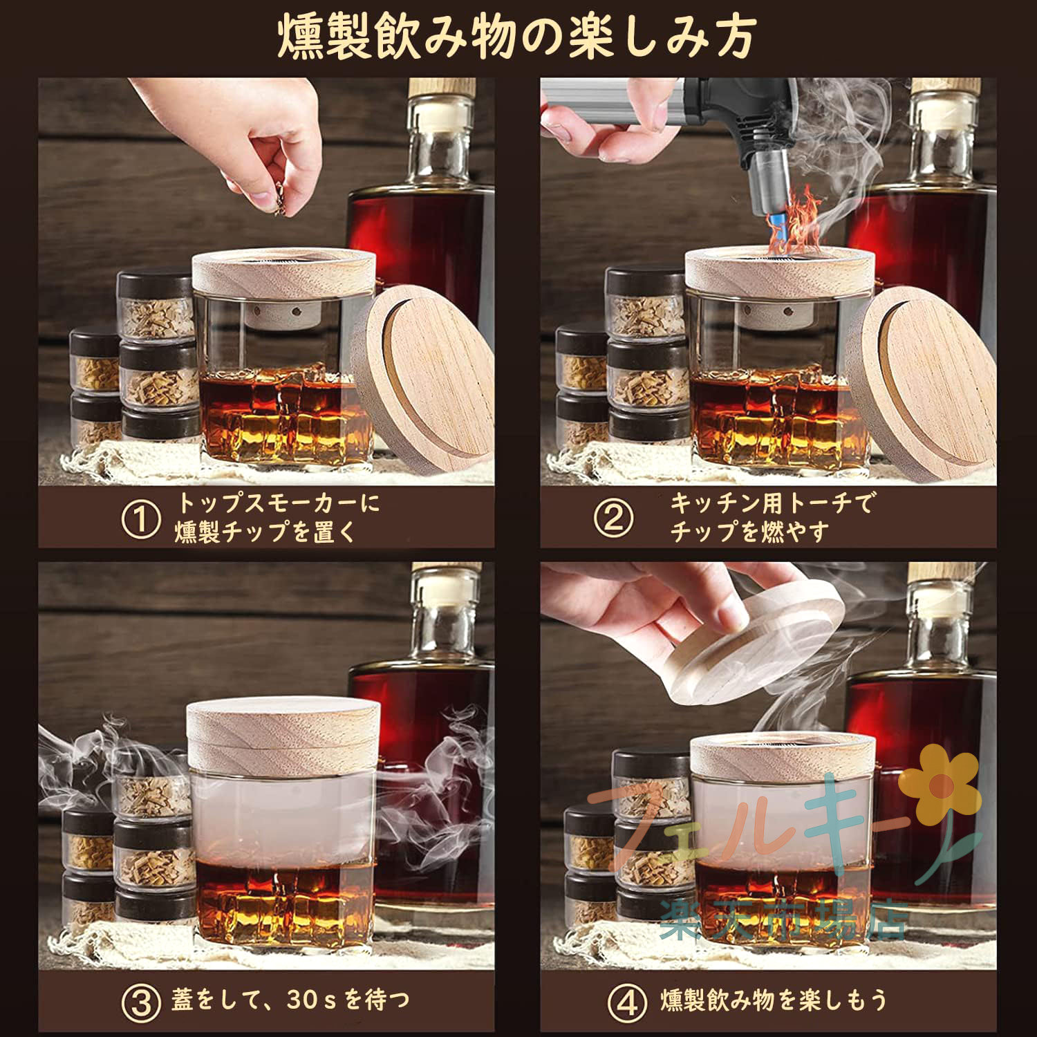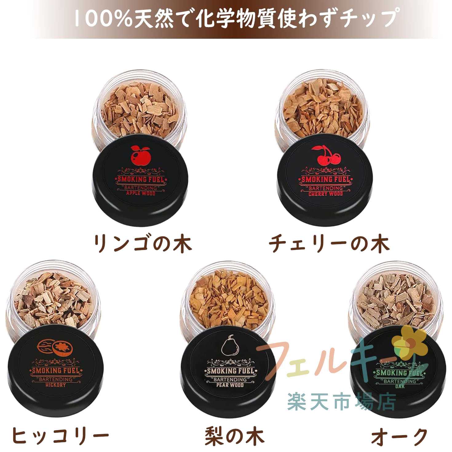 ITEM INFORMATION■ セット内容5つのフレーバーセット、100%天然木チップ、クリーニングブラシ、木製スプーン■ 素材天然オーク材、磨き上げた光沢表面、UFO形状デザイン■ 機能直径9cmでほとんどのグラストップにフィット、コンパクト収納■ チップ種類5種類の燻製チップで30種類以上の香りを再現■ 安全性100%天然素材使用、化学薬品不使用