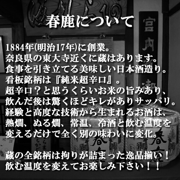 【日本で一番有名で一番売れている超辛口の限定品!】 【究極の贅沢搾り!最も良質な部分のみを特別に取った中取り熟成生原酒!】 春鹿(はるしか)の蔵、今西家は代々春日大社の神官をつとめていた由緒ある家柄であり、春日大社に現存する日本最古の酒蔵、”酒殿”で白酒・黒酒(しろき・くろき)を絶えることなく醸し続けています。 明治17年に神官を辞し福智院で酒造業を始めました。 仕込み水が春日山系の湧水で、奈良県には珍しい硬水です。 ですから酒質は、辛口ながら味に深みがあり、喉ごしのキレが良いのが特徴となっています。 まろやかで、ほのかな甘味が漂う奈良酒が多い中では、その個性がいっそう際立っているようです。 「春鹿純米超辛口」の中取り生原酒を約半年間、低温管理のタンクでじっくり熟成させました。 低温管理タンクでじっくりと熟成することで、米の旨味を引き出し、まろやかで口当たりの良く、柔らかなキレのあるお酒に仕上がっています。 肉料理から海鮮料理まで幅広くお楽しみ頂けます。 (1800ml=1.8L=一升瓶) (900ml=五合瓶) (720ml=四合瓶) 【奈良県】 【harushika/japanese sake】 【日-純米720】 【注意事項】 ●『お買い物ガイド』記載の1個口で発送出来る上限を超えた場合、楽天市場のシステムの関係上、自動計算されません。 当店確認時に変更させて頂き『注文サンクスメール』にてお知らせさせて頂きます。 1個口で発送出来る上限につきましては『お買い物ガイド(規約)』をご確認下さい。 ●写真画像はイメージ画像です。商品のデザイン変更やリニューアル・度数の変更等があり商品画像・商品名の変更が遅れる場合があります。 お届けはメーカーの現行品となります。旧商品・旧ラベル等をお探しのお客様はご注文前に必ず当店までお問い合わせの上でご注文願います。詳しくは【お買い物ガイド(規約)】をご確認下さい。 ●在庫表示のある商品につきましても稀に在庫切れ・メーカー終売の場合がございます。品切れの際はご了承下さい。 ●商品により注文後のキャンセルをお受け出来ない商品も一部ございます。(取り寄せ商品・予約商品・メーカー直送商品など) ●ご不明な点が御座いましたら必ずご注文前にご確認ください。