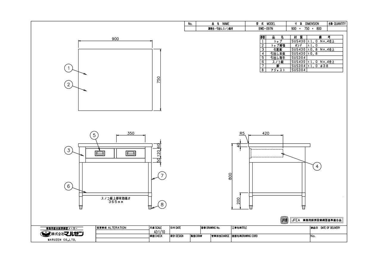 マルゼン ブリーム BWD-097N ステンレス製 調理台 引出スノコ板付 900×750×800mm バック無 JFEA適合 厨房 衛生的 [法人限定]