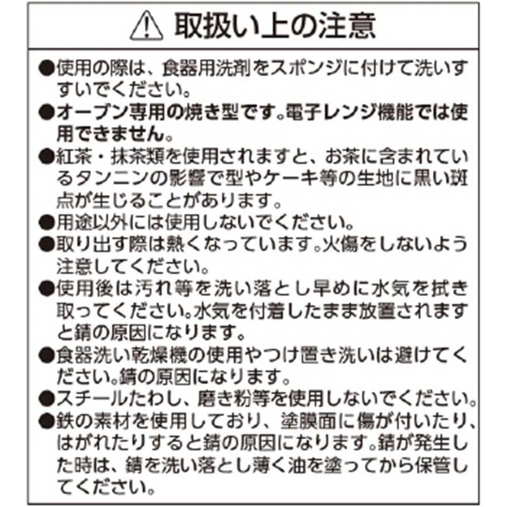 ※沖縄・離島への発送はできかねます。ご注文いただいた後に当店にてキャンセルさせていただく場合がございますのでご了承ください。 こちらの商品ページは同商品×2個分の商品ページです。 商品の特徴商品サイズ:約 幅9×奥行18.4×高さ6.5cm重量:約 0.13kg素材・材質:鉄、表面加工/ふっ素樹脂塗膜加工原産国:日本オーブン専用。電子レンジ機能では使用できません。 こびりつきにくく、お手入れが簡単なふっ素樹脂加工のケーキ焼型。※本製品は、お手入れしやすいようふっ素樹脂塗膜加工が施されておりますが、生地が型にくっつかないものではありません。ご使用の際は、下記いずれかの方法でご使用ください。(1)型に敷紙を敷く。(2)内面全体にまんべんなくバターを塗り小麦粉をはたいて型を冷蔵庫で冷やす。