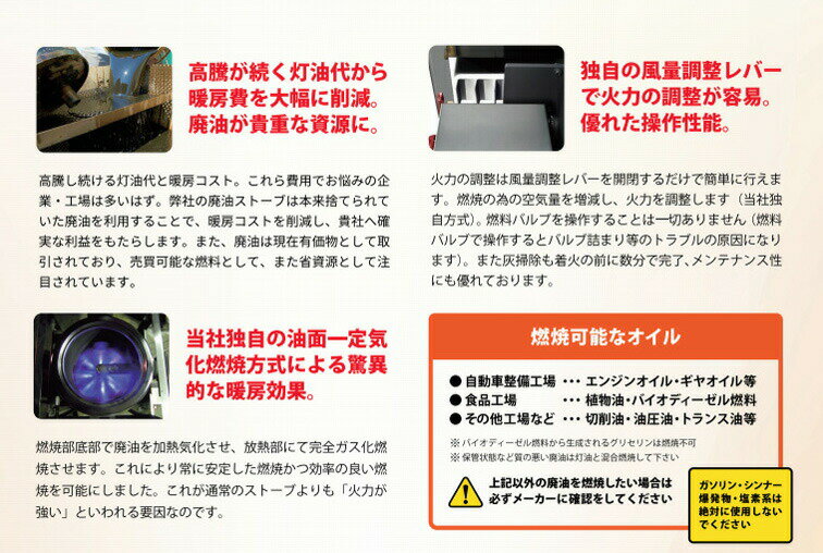 商品の特徴 信州工業 廃油ストーブ 工場向け 暖房目安10〜25坪 SG-50DX [送料別途お見積り] シリーズ標準機・暖房能力大 ●高騰が続く灯油代から暖房費を大幅に削減 高騰し続ける灯油代と暖房コスト。これら費用でお悩みの企業・工場は多いはず。弊社の廃油ストーブは本来捨てられていた廃油を利用することで、暖房コストを削減し、貴社へ確実な利益をもたらします。また、廃油は現在有価物として取引されており、売買可能な燃料として、また省資源として注目されています。 ●独自の燃焼方式による驚異的な暖房効果 廃油の完全ガス化燃焼構造特許による独自の燃焼装置が驚異的な暖房効果を生み出します。燃焼部底部で廃油を加熱気化させ、放熱部にて完全ガス化燃焼させます。これにより常に安定した燃焼かつ効率の良い燃焼を可能にしました。これが通常のストーブよりも「火力が強い」といわれる要因なのです。 ●容易で優れた操作性能 火力の調整は風量調節レバーを開閉するだけで簡単に行えます。燃焼のための空気量を増減し火力を調整します(当社独自方式)。燃料バルブを操作することは一切ありません(燃料バルブで操作するとバルブ詰まり等のトラブルの原因になります)。また灰掃除も着火の前に数分で完了。メンテナンス性にも優れております。 製品仕様 SG-6S (mini) SG-40S SG-50DX 特徴 ラインナップ最小モデル。休憩室などの小スペースや廃油と灯油を混焼したい方におすすめ。 デザイン・メンテナンス性に優れたタイプ。毎日の灰清掃や配管詰まりのメンテナンスが容易な配置になっています。 放熱性に優れ、遮熱する部分を極力減らし、工場暖房に適しています。バランスのとれた実績のあるスタンダードタイプ。 外形寸法 W500×D350×H690 W700×D483×H880 W785×D450×H923 暖房面積 1〜10坪 7〜20坪 10〜25坪 燃料消費量 0.5〜1.5リットル/時間 1〜3リットル/時間 1〜5リットル/時間 最大発熱量 15,000kcal/時間 30,000kcal/時間 50,000kcal/時間 標準 (平均) 発熱量 9,000kcal/時間 18,000kcal/時間 30,000kcal/時間 重量 42kg 79kg 82kg 煙突外径 106Φ 115Φ 115Φ 寒冷地オプション — ○ ○ 年間お得額(※1) 年間 150,000円 もお得! 年間 300,000円 もお得! 年間 500,000円 もお得! 燃焼方法 ガス化燃焼方式(ポット式) ガス化燃焼方式(ポット式) ガス化燃焼方式(ポット式) タンク容量 90リットル 90リットル 90リットル 電源 AC100V 50/60Hz AC100V 50/60Hz AC100V 50/60Hz 備考 ※2 ※3 ※3 ※4 ※1 1日(10時間)×25日×期間4ヶ月(灯油100円/L)で計算 ※2 当機は燃料消費量を抑えているため、燃焼しにくい廃油では使用できない場合があるため、燃焼に不安がある場合は上位機種をご検討ください ※3 50Hz地域に対応した送風ファンを搭載!60Hz地域と同等の火力を体感いただけます ※4 カラーバリエーション:シルバー/ブラック、本体加工:[通常仕様] 耐熱塗装/[オプション] アルファ処理加工(放熱体表面に特殊加工を施した耐熱性の高い加工。表面劣化がし難くより高寿命です。放熱対表面は無塗装となります。)