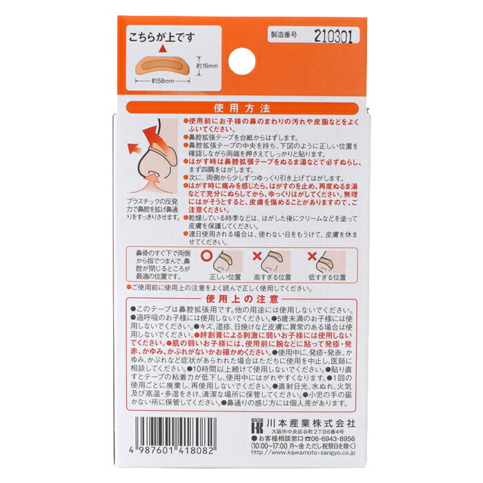 プラスチックの反発力で鼻腔を広げて鼻通りスッキリ ・鼻がつまる時に ・就寝時に ・スポーツに お子様の小さな鼻にフィットするこども用サイズです。 鼻がつまる時、就寝時に最適。無香タイプ。 商品説明広告文責トモナリ衛生材料株式会社052-931-8171 商品サイズ 約16mm×約58mm 製造元川本産業株式会社