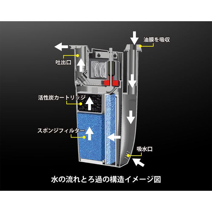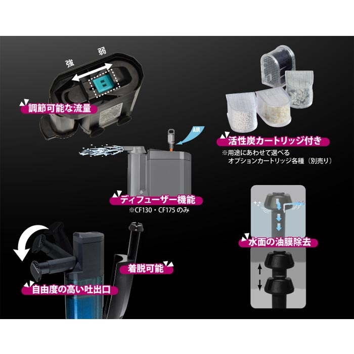 流量調整、自由度の高い吐出口、スポンジフィルター/カートリッジ、ディフューザーなど便利な機能が満載の水中フィルターとサーフェススキマーが一体化。 『商品特徴』 ・サーフェススキマーで水面の油膜を取り込み水中フィルターで分解します。 ・流量調整ができ、吐出口の角度も自在に変更可能です。 ・活性炭カートリッジ付きで吸着機能アップ。(別売で、用途に合わせて選べる4種類のカートリッジがあります) ・ディフューザー機能付き(CF130、CF175のみ) ・サーフェススキマーは脱着可能。横向き設置の水中フィルターとしても使用可能です。 『使用方法』 ・活性炭カートリッジやスポンジフィルターを水で軽く洗い、フィルターケースにセットしてください。 ・ポンプ全体が水につかるように設置してください。 ・サーフェススキマーは、フロートの先端が自由に水面に浮かぶよう、フィルター本体を水面の直下に、垂直に設置してください。 ・キスゴムで本体を水槽に取り付けた後、電源プラグをコンセントにさしてポンプを始動させます。流量を調節したい場合は、ポンプ本体を取り外し、インペラーケースカバーの流量調節レバーをずらして調節してください。 ※本製品は水中専用ポンプです。必ず屋内、水中で使用してください。 ※弱った魚、稚魚、小型魚などがストレーナー部の吸い込みに吸い込まれたり、本体と水槽の間にはさまることがありますのでご注意ください。 『水平使用の場合』 本製品を水平にして使用する場合、サーフェススキマーは外して使用してください。 『お手入れ・メンテナンス』 ※フィルターケースやポンプ部、エアディフューザーはやさしく分離し、定期的に掃除をおこなってください。 ※スポンジプレフィルターやスポンジフィルターは、約6ヶ月を目安に形が崩れたり汚れがとれなくなったら新しいものに交換してください。 ※スポンジフィルターと他のカートリッジ・スポンジとは、洗浄や交換のタイミングをずらすことにより、ろ過バクテリアの大幅な減少を防ぐことができます。 『製品仕様』 機種名:CF 175 周波数:60Hz 定格電圧:AC100V 消費電力:6.4W 流量(可変式):290~585ℓ/h 適合水槽:60cm以下 本体サイズ:(スキマー装着時)約幅117×奥行40×高さ250mm/(スキマー除外時)約幅90×奥行40×高さ245mm コード長:約1.7m 付属品:活性炭カートリッジ、スポンジフィルター、スポンジプレフィルター(CF 75、130、175)、エアディフューザー(CF130、175)、キスゴム 材質:ABS等 原産国:イタリア