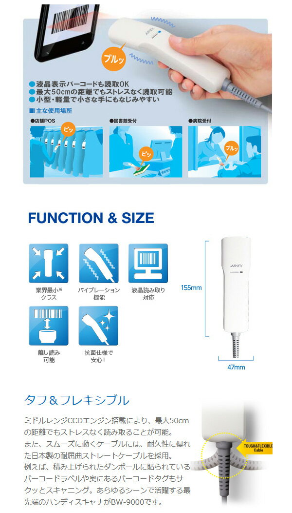 BW-9000 アイメックス バーコードリーダー USB接続 | 抗菌 GS1 一次元コード対応 CCDリニアイメージャ バーコードスキャナー AIMEX