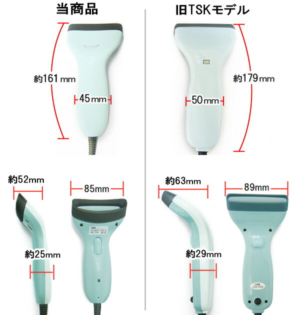 詳細仕様 製品番号 TSK-e(US) TSK-e(UC) ケーブルタイプ ストレート コイル JANコード 4580298762973 4580298763161 インターフェイス USB(HID/COM) ケーブル長 1.8m 約0.7〜1.2m 電源供給 接続先より供給 読み取り可能コード Code 39, Full ASCII Code 39, Code 32, Code 128, Code 93,Code 11, Codabar/NW7, All UPC/EAN/JAN code (EAN-13,EAN-8, UPC-A, UPC-E, EAN-128), Interleave 2 of 5,STD 2 of 5, Industrial 2 of 5, matrix 2 of 5, Chinese Postage Code, IATA, MSI/PLESSY, Italian Pharmacy Code, Telepen. 読み取りセンサー 2500pixel(CCD) マイクロプロセッサ 32 bit 分解能 0.1mm(4mil) PCS値 ≧45% ウィンドウ幅 82 mm 光源 λ=660 nm 可視光Red LED スキャン レート MAX200 スキャン/秒 読取インジケーター Red LED及びアジャスタブル ボリューム ブザー 入力電源 DC 5V±5% 動作電流 100〜120 mA 衝撃耐性 1.5mからコンクリートに落下し正常動作 付属品 日本語設定マニュアル 外形寸法 W85mm×H25mm×L161m 重量 95g (本体のみ) 対応OS Windows XP, Vista, 7, 8, 8.1, 10 (Macはサポート外) 対応スタンド 置台(HOL-10)、クリアタイプ置台(HOL-CL) 認証 EMC/EN 55032/RoHS 2.0/REACH SVHC ※RSSコード(GS-1)は非対応となります。 ※掲載値はメーカー規定の測定方法によるものです。保証値は別途仕様書をご参照ください。 ※記載内容は予告無く変更されることがあります。あらかじめご了承ください。 【関連キーワード】 バーコードリーダー 一次元コード 簡単 軽量 タッチ式 バーコードスキャナー エフケイシステム FKsystemセットで税込2640円OFF!全部揃っておトク!スマレジ・Airレジ・square対応POSレジセット TSK-eエフケイシステム バーコードリーダー USBモデル | FKsystemお得なまとめ買い10台セット 読取り精度・価格帯でバランスの取れた入門モデル わずか95gの超軽量ボディで使いやすい、入門モデルにぴったりのバーコードリーダー。軽くて持ちやすいので長時間作業でも疲れにくい。 わずか95gの軽量・コンパクトボディ 200スキャン/秒の読み取り性能 様々な規格のバーコードに対応する読取り性能 タッチ式で初心者でも操作簡単 TSK-eは価格・読取り精度ともにバランスの取れた、バーコードリーダーの入門モデルです。旧モデルから読取精度・読取距離がアップし、より使いやすくなりました。 本体重量はわずか95gの超軽量!長時間の使用でも疲れません。 難しい設定は不要。接続するだけで簡単に使用できます。キーボードエミュレーションで認識するのでドライバーも不要です。 ISBNや新雑誌コードの読み取り設定・読み取り後に出力する改行コードの設定等は、付属のマニュアルで簡単に行えます。 USB接続モデルのケーブルは、ストレートタイプとコイルタイプの2種類からお選びいただけます。 SPEC スペック 製品型番ストレート:TSK-e(US)コイル:TSK-e(UC) インターフェイスUSB(HID/COM) サイズW85mm×H25mm×L161m 電源供給接続先より供給 重量95g (本体のみ) ケーブルストレート(約1.8m)コイル(約0.7〜1.2m) メーカーエフケイシステム FKsystem メーカー保証1年間 掲載値はメーカー規定の測定方法によるものです。保証値は別途仕様書をご参照ください。 記載内容は予告無く変更されることがあります。あらかじめご了承ください。 上記の対応アプリは、当店が公式ページにて対応状況を確認して掲載したものです。掲載されていないアプリの対応状況は、直接開発元にお問い合わせ下さい。 ケーブルタイプは2種類よりご選択いただけます ストレートタイプはケーブル全長:約1.8m コイルタイプはケーブル全長:約800mm(その内コイル部分は約150mmです) ※コイルタイプは伸縮性がありますので、引き延ばせばストレートタイプの全長に近い長さにもなります。 販売・在庫管理に 製品のJANコードなどを販売管理ソフト等で管理する際に、コードのデータを入力するのに便利です。宅配伝票にもバーコードがついているので、出荷管理にも活用できます。 バーコードリーダーを利用することで手入力による人為的ミスを防ぎ、作業時間の短縮につながります。 操作方法 パソコンに接続すると起動音が鳴り、背面の赤いLEDが点灯します。 本体の下側にあるトリガーボタンを押します。 バーコードの両端までLEDの中に入れるとデータが送信されます。 読取りについて TSK-eはバーコードにタッチするように近づけてスキャンします。本体ヘッドの幅よりも幅の狭いバーコードに適しています。 基本的にはバーコードに近接させて読み取りを行いますが、若干程度は離すことも可能です。距離としては0〜8cm程度のレンジ幅となります。 読み取り可能な条件は、コードの細密さ・印刷状態・環境光などに左右されます。離しすぎるとコードは読み取りにくくなり、またバーコードが小さい・細かい場合などは、特に近接させる必要があります。明るすぎる場所も、読み取りにくくなります。 データ入力について バーコードリーダーでデータを読み取ることは、キーボードでデータ入力をするのと同じですが、初期設定では、バーコードのデータが入力された後に改行コード(Enter)が入力されます。 この改行コードは設定を変更する