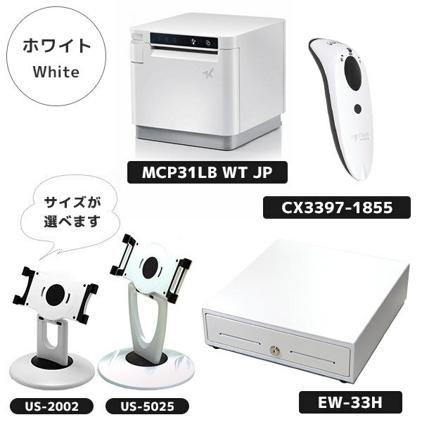 関連リンク その他のお得なPOSレジセットはこちらセットで税込2640円OFF!全部揃っておトク!スマレジ・Airレジ・square対応POSレジセット MCP31LB-33SET2iPad向け スター精密 mC-Print3 POSレジ4点セット iPadなどのタブレット利用のPOSレジにピッタリの、周辺機器のPOSレジセットです。人気のPOSアプリ「スマレジ」「エアレジ AirREGI」「Square スクエアPOS(iOSのみ)」「Stores ストアーズレジ」でお使いいただけます。 スター精密のレシートプリンター「mC-Print3」とソケットモバイルのバーコードリーダー「SocketScan S700」、33cm幅のキャッシュドロア「E-33H」、iPadで使える汎用タブレットスタンドのセットになります。 対応のロール紙6巻を、サービスで一緒にお届けします。届いてすぐにお使いいただけます。 セット内容 レシートプリンターシリーズ名:mC-Print3ホワイト:MCP31LB WT JPブラック:MCP31LB BK JP キャッシュドロアシリーズ名:E-33Hホワイト:EW-33Hブラック:EB-33H バーコードリーダーシリーズ名:SocketScan S700ホワイト:CX3397-1855ブラック:CX3803-2563 タブレットスタンドホワイト:US-2002W(or 5025W)ブラック:US-2002(or 5025) + レシートプリンター mC-Print3 53,680 円 キャッシュドロア E-33H 16,170 円 バーコードリーダー SocketScan S700 60,720 円 タブレットスタンド US-2002 6,050 円 対応ロール紙 サービス 単品合計 136,620 円 割引額 2,640 円 セット価格(税込) 133,980 円 ※上記の割引額はUS-2002(6,050円)を選択された場合です。US-5025は通常販売価格6,710円ですので、割引額は3,300円となります(税込) ※Square(スクエア)の対応はiOSのみとなります。 【 ご確認ください 】 各セット商品の詳細情報は、以下の各セット内容にあるリンク先にございます。お客様都合による返品・交換は承っておりませんので、ご購入前にご利用にあたって必要な情報を、詳細ページより必ずご確認下さい。 セット1:レシートプリンター mC-Print3スター精密 コンパクト レシートプリンター | Star Micronics iPadなどのiOS端末に給電しながら通信可能 レシートが丸まらないデカール機能 防虫設計・防滴性能IPX2 シンプルで高級感のあるデザイン レシートプリンタ mC-Print3 詳細情報 セット2:キャッシュドロア E-33Hエフケイシステム 33cm幅 キャッシュドロア | FKsystem Bluetoothでワイヤレス接続 満充電から8時間以上の長時間動作 ボディに抗菌材を使用 最大33cm離れた場所から読み取れる MFi認証取得済み 35cm幅 キャッシュドロア E-33H 詳細情報 セット3:バーコードリーダー Socket Scan S700ソケットモバイル ワイヤレス バーコードリーダー | Socket Mobile Bluetoothでワイヤレス接続 満充電から8時間以上の長時間動作 ボディに抗菌材を使用 最大33cm離れた場所から読み取れる MFi認証取得済み バーコードリーダー Socket Scan S700 詳細情報 セット4:タブレットスタンド US-2002/5025エフケイシステム タブレットスタンド | FKsystem 首振り360度回転可能 店舗カウンターでタブレット端末利用に最適 対応タブレットサイズ US-2002幅168〜205mm US-5025幅197〜240mm 【 ご注意ください 】 スタンドは汎用タイプです。縦でも横でも固定できるので、お手持ちのタブレットの長辺・短辺のいずれかが上記の対応サイズ内なら、お使いいただけます。 全てのタブレットに対応しておりませんので、必ずご購入前に下記リンク先の詳細情報、および対応サイズをご確認下さい。お手持ちのタブレットにサイズが合わなかった場合でも、返品・交換は承っておりません。 FKsystem タブレットスタンド US-2002 詳細情報 FKsystem タブレットスタンド US-5025 詳細情報 mC-Print3対応 58mm レシートロール紙 FK588080(80巻) mC-Print3対応 80mm レシートロール紙 FK808080(60巻) 【 ご注意ください 】 当製品は、ご利用のアプリケーション(システム)が各機器をサポートしている場合にのみ使用できます。 サポート状況につきましては、アプリケーション(システム)の提供元にお問合せください。必ずお使いのシステムの対応状況をご確認の上でのご購入をお願い致します。 各セット商品の詳細情報を、事前に単品販売ページでご確認の上でご購入下さい。お客様都合による返品・交換は承っておりませんので、ご購入前にご利用にあたって必要な情報を必ずご確認下さい。