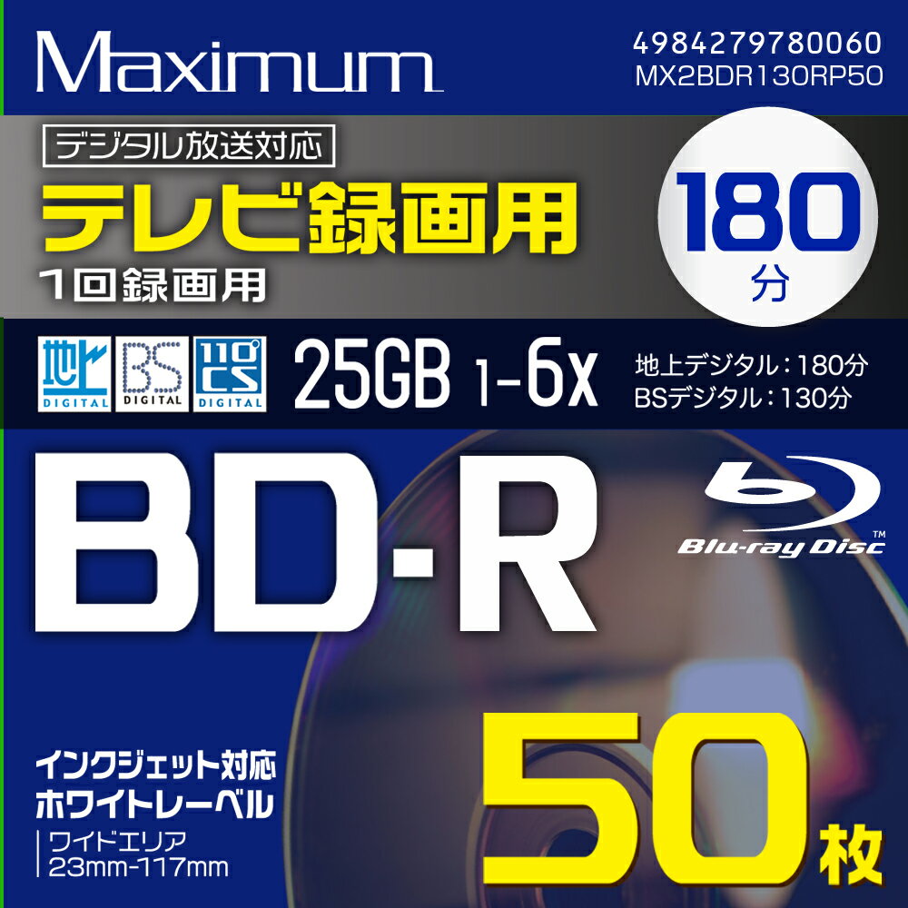 BD-R ブルーレイディスク 録画用 1回 6倍速 25GB 50枚 スピンドルケース ホワイトワイドプリンタブル インクジェットプリンタ対応 MXBR25JP50