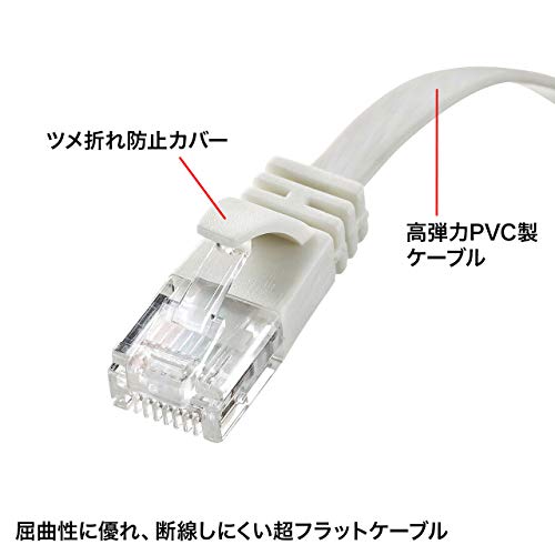 超フラット高弾力PVC製ケーブル、ツメ折れ防止カバー付き、10Gビッイーサネットにも完全対応のCAT6AフラットLANケーブル。 エンハンスドカテゴリ5の5.0倍、カテゴリ6の2.0倍の伝送帯域500MHz。余裕の伝送特性でエラーを防ぐ高性能LANケーブルです。 10ギガビットイーサネット(10G BASE-T)にも完全対応の為、超高速ネットワーク環境でも使用可能。 薄さ1.4mmのフラットタイプで、カーペット下やドアの隙間の配線にも最適。 断線しにくい屈曲性に優れた高弾力PVC製ケーブルを採用。 プラグのツメ(ラッチ)が折れるのを防ぐ、ツメ折れ防止カバー付き。 火災の延焼原因になりにくい難燃素材を使用。