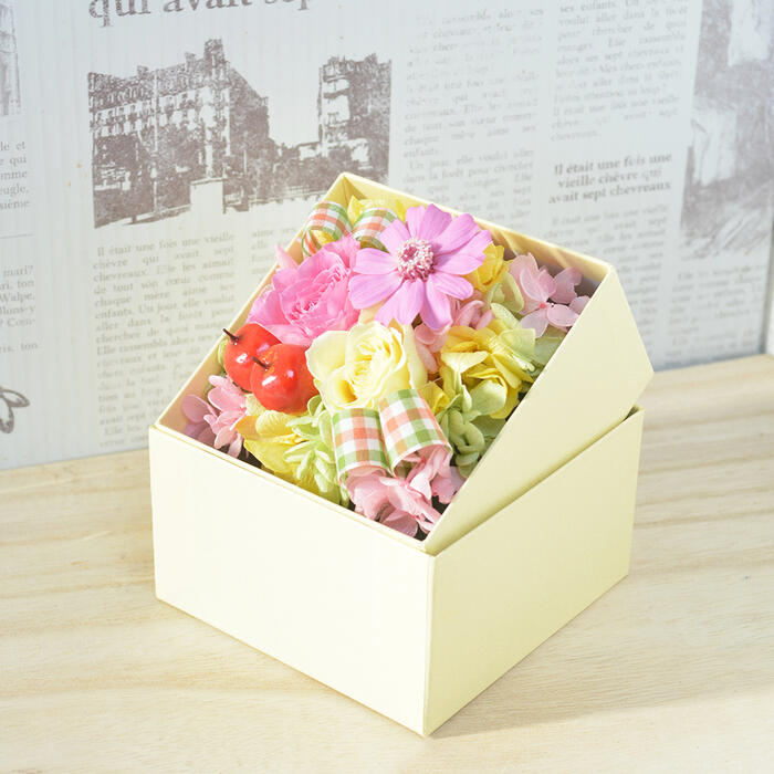 ご利用用途:開業祝い、開業・オープン祝い、移転祝い、引越し祝い、誕生日祝い、結婚記念日、歓迎・退職祝い、卒業祝い、出産祝い、公演・楽屋見舞い、ビジネス、結婚祝い、記念日、退院祝い、母の日、敬老の日、就職祝い、楽屋花・金婚式・銀婚式・還暦・緑寿・古希・喜寿・傘寿・米寿・卒寿・白寿・百寿・快気祝い・ギフト・プレゼント・花・フラワーギフト商品詳細 ペットのお供え用としてカラフルなボックスに収められたこのアレンジメントは、バラ、アジサイ、ジニアを使用し、優雅で心温まる雰囲気を演出します。イエローとピンクを基調とした色合いが、明るさと安らぎをもたらし、大切なペットへの思いを美しく表現します。特別な場所に飾ることで、心に残るひとときを提供します。 商品サイズ 約高さ7.5cm 幅9.5cm 奥行9.5.3cm 使用花材 バラ、アジサイ、ジニア