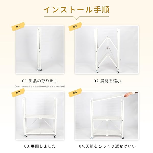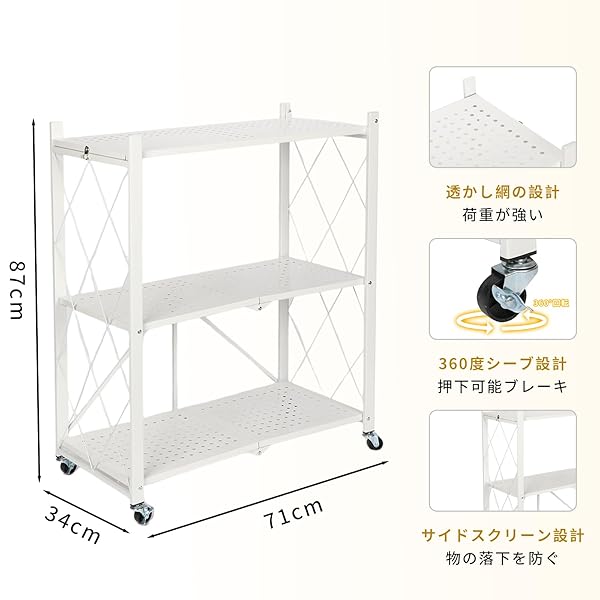 【送料無料】折り畳み メタルラック 折りたたみラック 3層 幅70CM 折りたたみ収納ラックメタルラック 折り畳み棚 360°キャスター付きで移動可能 設置不要 家庭用収納ラック キッチン 寝室 応接間 書斎などに (白, 三階)
