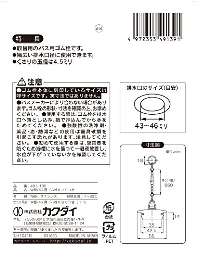 -/上辺42.5×下辺35×高さ14mm/491-135・Size:上辺42.5×下辺35×高さ14mm・パッケージ個数:1・材質:nbr・くさりの長さ:650mm・サイズ:上幅48×下幅36×高さ15mm・パッケージサイズ:縦125×幅95×奥33mm【特長】 ●バス用ゴム栓くさり付です。 ●バス用ゴム栓。 ●くさり付バス用ゴム栓です。 ●浴槽内排水金具のJIS規格サイズなのでほとんどのバスメーカーに合います。