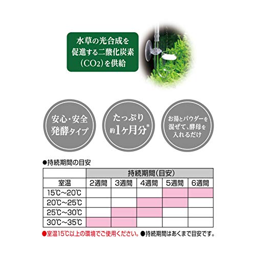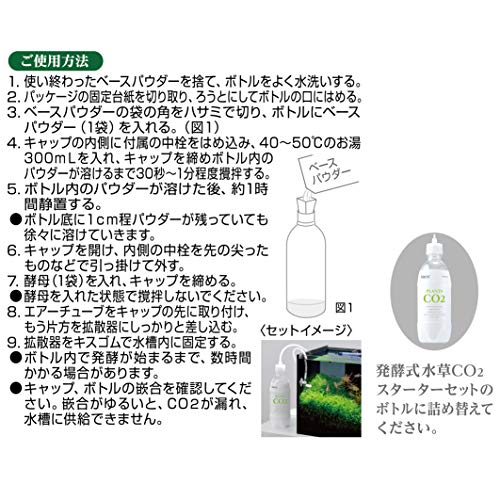 -/-/50570・パッケージ個数:1・本体サイズ (幅X奥行X高さ) :20×6.5×6.5cm・本体重量:0.18kg・原産国:日本商品紹介 安心・安全な発酵式CO2スターターキットの詰替え用パウダー。たっぷり約1か月分。 ・発酵式水草CO2スターターセットのボトルに詰め替えていただくことで、約1ヶ月CO2を添加することができます。※室温26度の場合(持続期間は室温によって異なります。) ・水草の光合成を促進し、イキイキと育てることができます。※水草の育成には光、CO2、栄養のバランスが重要です。水草の種類や飼育環境によっては水草の育成ができないこともあります。エアーポンプや水中エアーリフト式フィルター等でエアレーションすると、CO2が水中から放出され、効果を発揮しにくくなります。 ・ベースパウダーをお湯で撹拌して酵母を混ぜるだけで簡単セッティング。 セット内容:ベースパウダー、酵母、中栓 ※本製品にはボトル(キャップ)、エアーチューブ、拡散器は含まれておりません。 ボトルサイズ:約幅6.5×奥行6.5×高さ20cm 使用上の注意 ※本製品は屋内観賞魚飼育専用です。他の目的には使用しないでください。※子供、認知症の方の手の触れない所に保管してください。※本製品は飲料ではありません。間違って飲み込んだ場合は大量の水を飲み、医師に相談してください。※セット時、魚の出し入れ、点検、掃除など水中に手を入れる時は、必ず水槽で使用している電気製品すべての差し込みプラグを抜いてください。※熱湯は使用しないでください。容器の変形や怪我の原因になります。※水槽内の水がボトルに入らないようにしてください。酵母の活動が阻害されてCO2が発生しない原因になります。※エアーチューブが水槽のフタなどに挟まれたり、エアーチューブの上に物を置くなどして、エアーチューブが潰れないようにしてください。ボトルやキャップの変形の原因になります。※セットされた状態でボトルを振らないでください。内容液がエアーチューブ内に入り詰まる恐れがあります。※万が一詰まった場合、キャップを開ける際に、内容液が噴き出る場合があります。洗面所等でゆっくりとあけてください。※水槽にボトルの内容液が入らないように注意してください。※スピードコントローラーや電磁弁は使用しないでください。※商品付属の拡散器以外を使用されますと、うまく泡が出ない場合があります。※キャップ先端の接続パーツを抜き差ししないでください。ゆるくなってCO2が漏れる原因になります。※拡散器は長期間使用すると、セラミックが目詰まりする可能性があります。目詰まりすると、泡が大きくなったり、出なくなるので、定期的にブラシ等でこすって汚れを落としてください。※ベースパウダーの詰め替えや掃除などで拡散器をつなぎ直すとCO2が再度出てくるまでに時間がかかります。※本製品から出てくるCO2は圧力が高くないため、拡散器全体から泡が出ません。※室温15度以上の環境でご使用ください。室温が低い環境だとCO2の発生が悪くなります。万が一室温が低い環境でご使用になられる場合は、使い捨てカイロをタオルで巻くなどして、ボトルを温めてください。 原材料・成分 糖類、増粘剤、酵母、他 使用方法 1.使い終わったベースパウダーを捨て、ボトルをよく水洗いする。パッケージ固定台紙を切り取り、ろうとにしてボトルの口にはめる。2.ベースパウダー1袋をボトルに入れる。3.キャップ内側に中栓をはめ、40-50度のお湯300mLを入れる。4.キャップを締めボトル内のパウダーが溶けるまで30秒-1分程度撹拌する。5.キャップ内のパウダーが溶けた後、約1時間静置する。6.キャップを開け、中栓を先の尖ったもので引っかけて外す。7.酵母1袋を入れ、キャップ締める。※酵母を入れた状態で撹拌しないでください。8.エアーチューブをキャップの先に取り付け、もう片方を拡散器にしっかりと差し込む。9.拡散器をキスゴムで水槽内に固定する。※ボトル内で発酵が始まるまで、数時間かかる場合があります。※キャップ、ボトルの嵌合を確認してください。嵌合がゆるいと、CO2が漏れ、水槽に供給できません。 ご注意(免責)>必ずお読みください ※製品の仕様、デザイン、価格等予告なく変更することがあります。