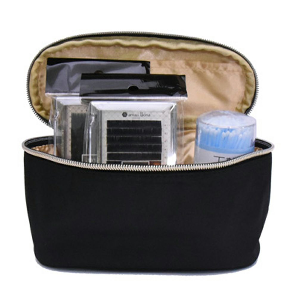 商品説明 ゴールドサテン地が美しく、高級感を漂わせる、使い勝手抜群の機能性をあわせ持つスマートバニティ。 小と大の2種類のサイズをご用意しました。 商品詳細 数量 1個 サイズ 約170×70×100mm カラー ブラック 材質 ポリエステル 使用方法 まつ毛エクステ商材の持ち運びや、メイクポーチとしてご使用ください。 ■製造国/原産国 日本 ■区分 雑貨 注意事項 ※ 撮影・ディスプレイ等の関係で実物と色などが多少異なる場合がございます。