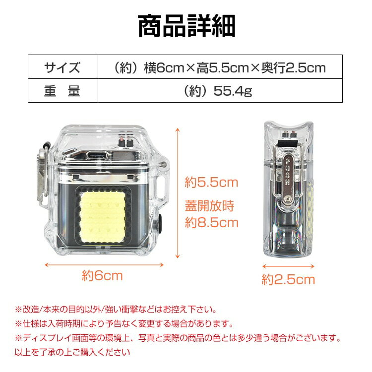 ガスオイル切れの心配がありません!防風レベル3~5で強風を気にせず使えます!電池残量を4段階で表示します!高輝度COBライト付きで暗がりでも活躍します!カラーは選べる2色!【商品内容】:電子ライター【サイズ】:(約)6cm×5.5cm×2.5cm【重量】:(約)55.4g【カラー】:ブラック/オレンジ○使用上の注意事項○着火部分にはお手を触れないように注意してくださいお子様の手の届かない所で管理してください改造/本来の目的以外/強い衝撃などはお控え下さい。仕様は改善の為に予告なく変更する場合があります。ディスプレイ画面等の環境上、写真と実際の商品の色とは多少違う場合がございます。○以上を了承の上ご購入ください○ガスオイル切れの心配がありません!防風レベル3~5で強風を気にせず使えます!電池残量を4段階で表示します!高輝度COBライト付きで暗がりでも活躍します!カラーは選べる2色!【商品内容】:電子ライター【サイズ】:(約)6cm×5.5cm×2.5cm【重量】:(約)55.4g【カラー】:ブラック/オレンジ○使用上の注意事項○着火部分にはお手を触れないように注意してくださいお子様の手の届かない所で管理してください改造/本来の目的以外/強い衝撃などはお控え下さい。仕様は改善の為に予告なく変更する場合があります。ディスプレイ画面等の環境上、写真と実際の商品の色とは多少違う場合がございます。○以上を了承の上ご購入ください○
