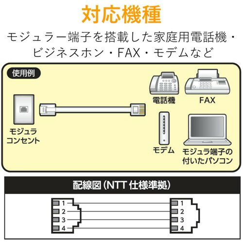 モジュラーコンセントと家庭用電話機・ビジネスホン・FAX・モデムなどを接続できる6極4芯タイプのツメ折れ防止モジュラーケーブル。 屈曲に対する耐久性が高い新素材を採用し、通常の使用環境では絶対にツメが折れないモジュラーケーブルです。※1000回の屈曲検査に合格(当社検証) ツメ折れによるケーブルの脱落が防げ、長期にわたってしっかりとモジュラージャックに固定することができます。 NTT仕様準拠の6極4芯タイプです。6極2芯の機器にも使用可能です。※NTT仕様に準拠していない機器には使用できません。 せまい所でも配線しやすく、取り回ししやすいスリムケーブルです。