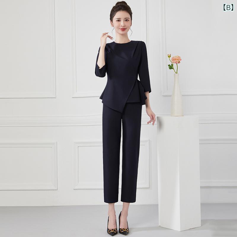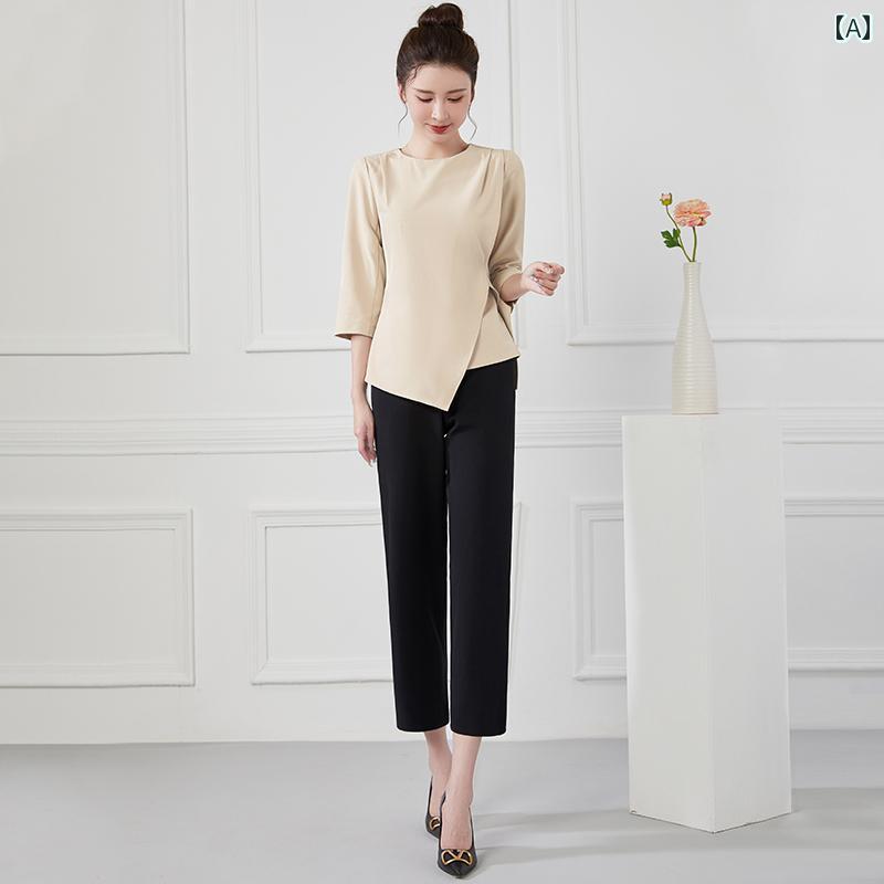 エステ ユニフォーム パンツ 無地 シンプル ラウンドネック 美容院 サロン フットバス ペディキュア 技術者 作業服 女性 秋 スパ ヘルスクラブ マッサージ セットアップ 大きいサイズ アプリコット ネイビー