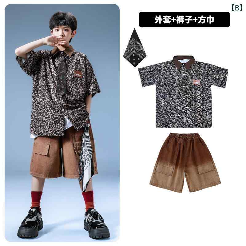 キッズ シャツ 男の子 女の子 半袖 ストリート ダンス ヒョウ柄 ヒップホップ 夏 上下セット タンクトップ スカーフ ネクタイ チャーム