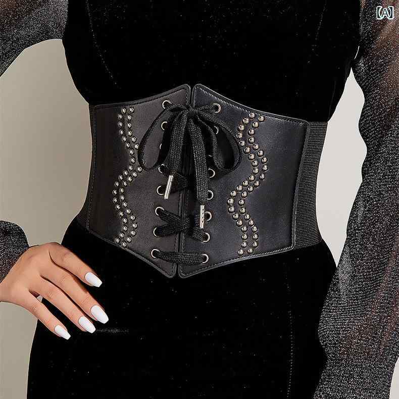 レディース コルセットベルト 韓国 レトロ PUレザー ワイド 幅広 ワンポイント アクセサリー 装飾 小物 伸縮性 レースアップ リベット ウエストゴム 個性的 かっこいい 黒
