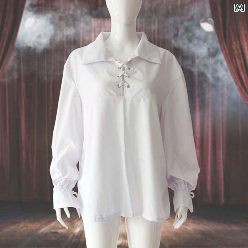 中世 衣装 メンズ ハロウィン コスプレ シャツ 編み 紐 レトロ ドラマ ステージ パフォーマンス 柔らかい 長袖 大きいサイズ 白 黒 襟 折り返し