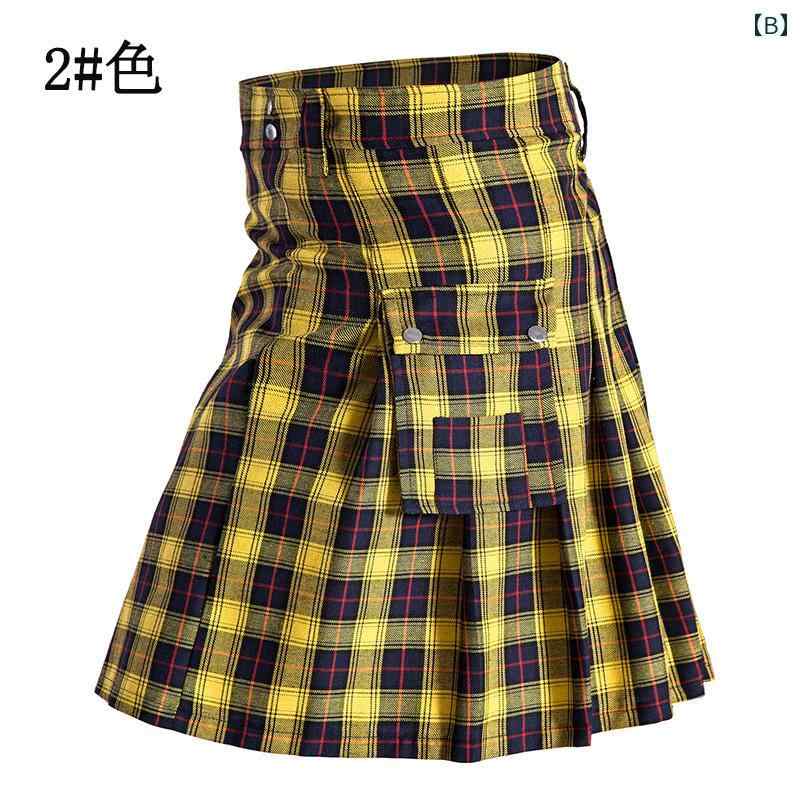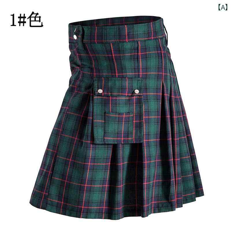 スカート メンズ カジュアル ボトムス レトロ おしゃれ ベルト装飾 ポケット 男性用 大きいサイズ ゆったり 普段使い お出かけ フェス パンク スコットランド チェック柄 プリーツ レディース パフォーマンス ハイウエスト 緑 黄色 赤