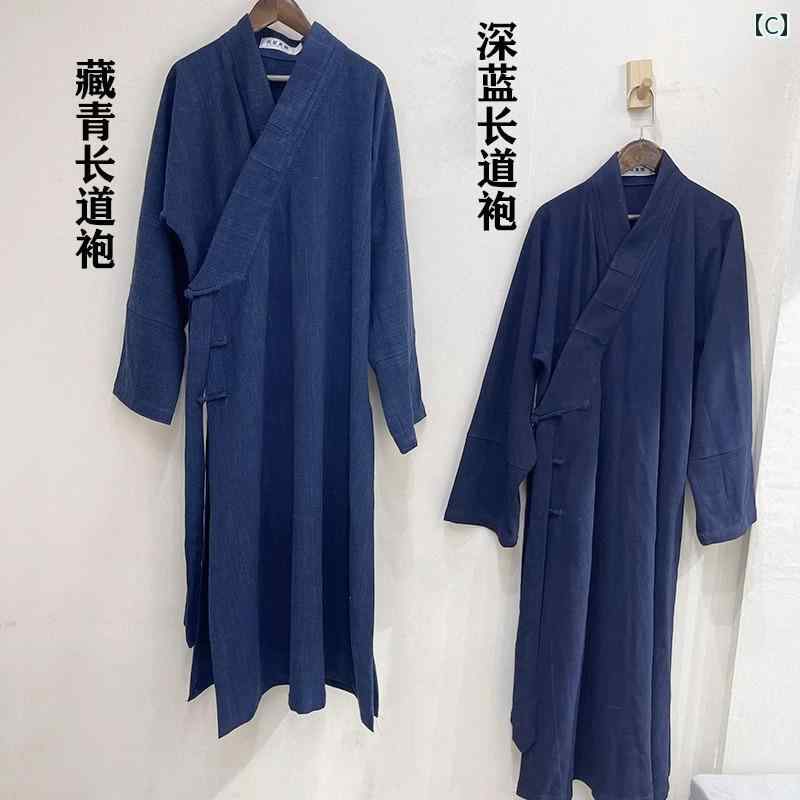 中国 衣装 道士服 春秋 厚手 綿 麻 大人 メンズ 大きいサイズ ゆったり ロング ローブ 斜め襟 紐 長袖 シンプル 無地 紺 黒 白
