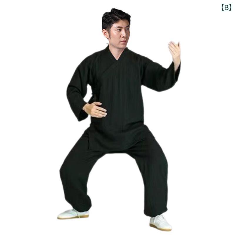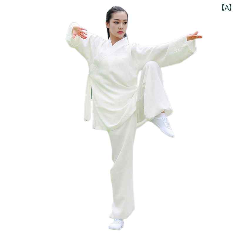 中国 衣装 道士服 太極拳 レディース メンズ 大人 大きいサイズ ゆったり 上下セット 夏 麻 斜め襟 紐 長袖 ロングパンツ シンプル 無地 白 紺 黒