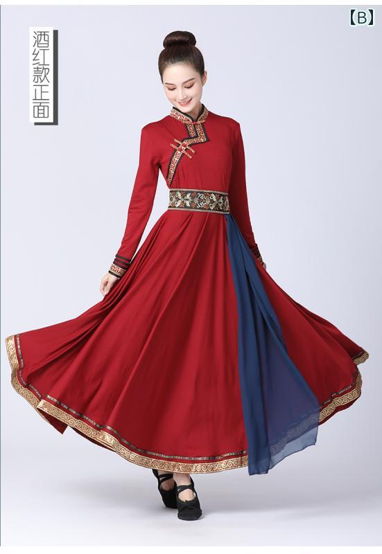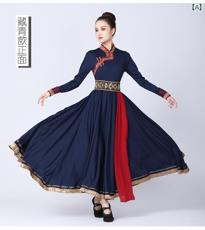 モンゴル 衣装 族 ダンス パフォーマンス 演出 ステージ 通気性 吸湿 ベルト スタンドカラー ロング ショート ワンピース レディース レトロ 装飾 紺 赤