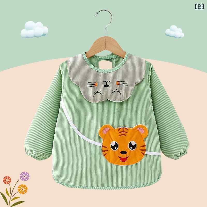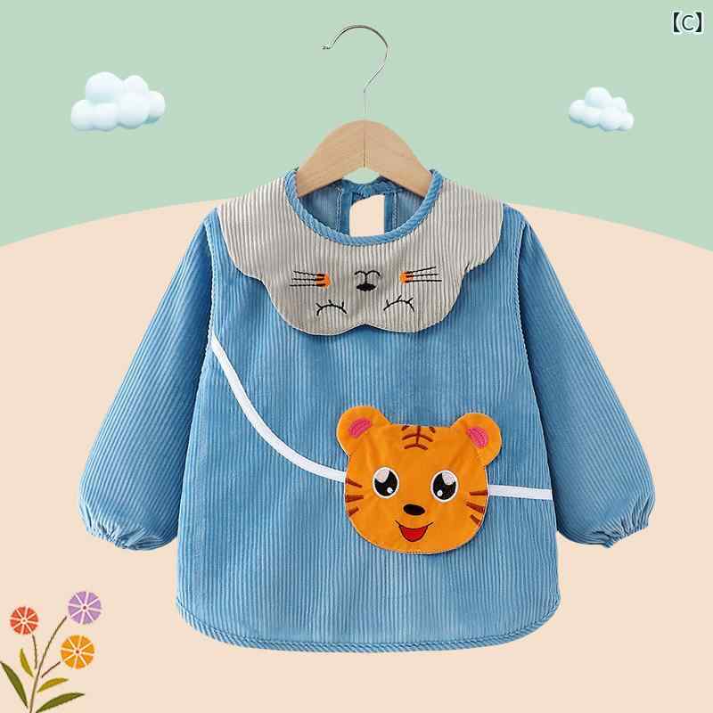 スモック 子供 キッズ ベビー 男の子 女の子 秋冬 後ろ開き 紐 着脱簡単 長袖 よだれかけ付 ポケット 防水 汚れにつよい 柔らかい コーデュロイ エプロン 砂遊び 工作 かわいい パンダ ウサギ 恐竜 青 黄色 ピンク