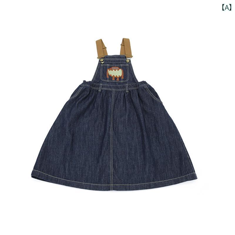 ジャンパースカート 子ども 女の子 春夏 秋 ボトムス サロペット オーバーオール 刺繍 伸縮性 ポケット ミモレ丈 デニム かわいい カジュアル 大きいサイズ モンスター 紺