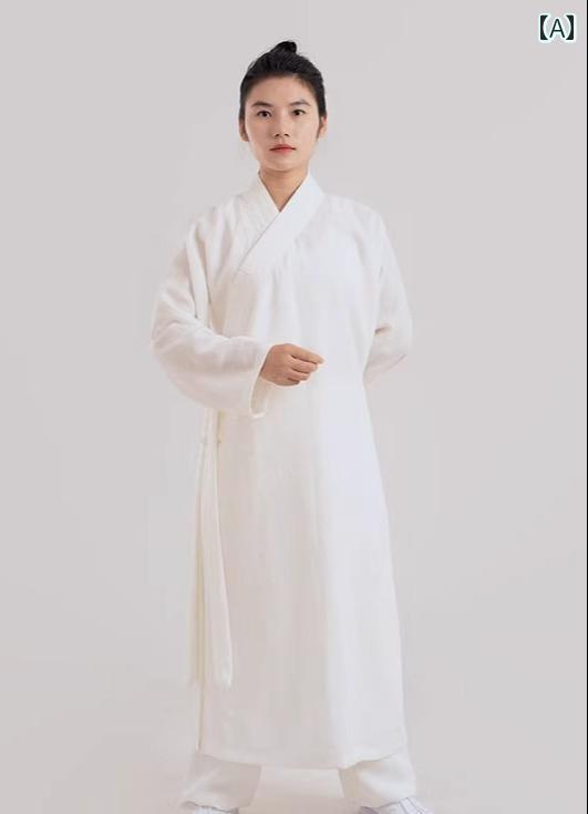 中国 民族 衣装 道士服 メンズ レディース 春夏 ローブ チャンパオ 長袖 長ズボン 斜め襟 ウエストゴム ポケット 上下セット チャイナボタン 薄手 通気性 吸湿 柔らかい 道教 僧侶 カンフー 太極拳 無地 大きいサイズ 紺 黒 白