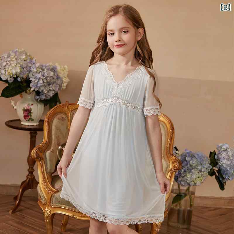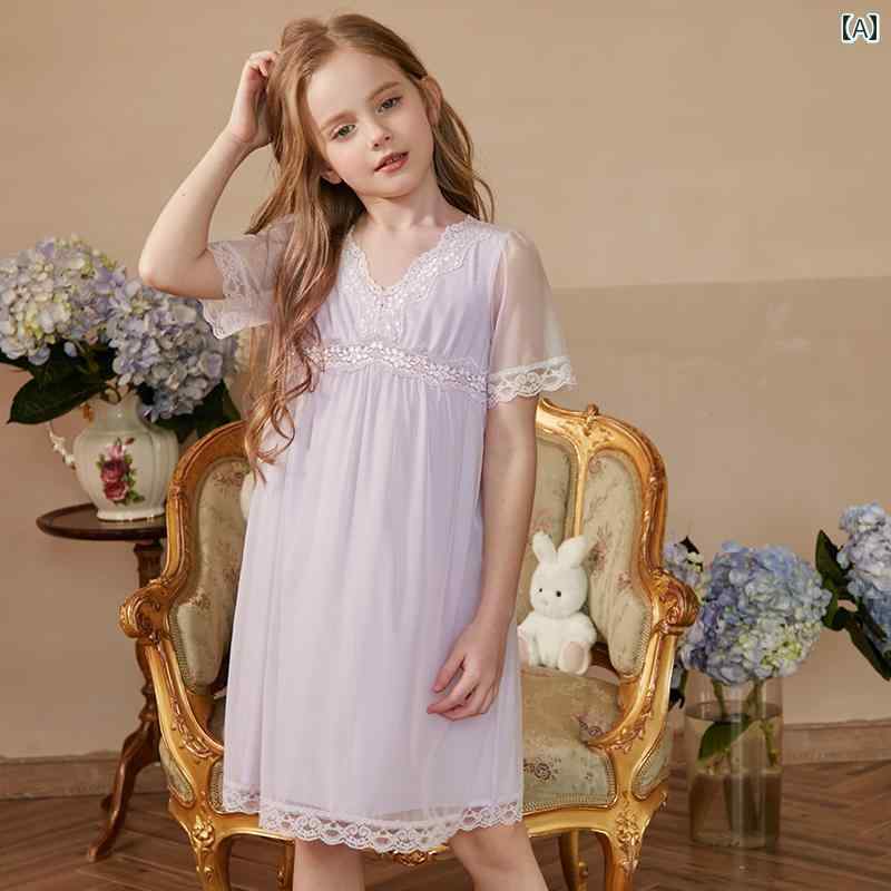 パジャマ キッズ 半袖 女の子 ワンピース 春夏 Vネック 膝丈 Aライン レース 花 涼しい 薄手 ソフト ルームウェア かわいい プリンセス 紫 青 ピンク