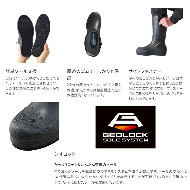 仕様表■プロテクト性を重視したジオロック搭載ブーツベースに1.2mmのラバー、内側に発砲ラバー1.7mmを採用したジオロック搭載の磯用ブーツです。脱ぎ履きしやすいようにサイドファスナーを採用。ジオロック搭載のため、自分でソールを張り替えたり、場所に合わせてソールの種類も簡単に変えることができます。■簡単ソール交換自分でソール交換ができるだけでなく、フィールドの状況に合わせてソールの種類を簡単に変更、張替えができます。■厚めのゴムでしっかりと保護2.9mm厚のラバーでしっかりと足を保護。爪先かかとは積層構造で更に保護性高くなっています。■サイドファスナー厚みのあるゴムを採用しブーツ自体が自立するのでそもそも脱ぎ履きは楽にできます。更にマチ付ファスナーで開口部がより大きく開くのでより便利になっています。SHIMANOシマノ FB-120W リミテッドプロ ジオロックブーツ カットラバーピンフェルト●品番:FB-120W ●サイズ:L●ジオロック交換ソール対応サイズ:L●目安足サイズ(cm):26.0〜26.5●ふくらはぎ周囲寸法(cm):42●ソールタイプ:カットラバーピンフェルト●ジオロック交換ソール対応種類:中丸●カラー:リミテッドブラック詳細はこちら