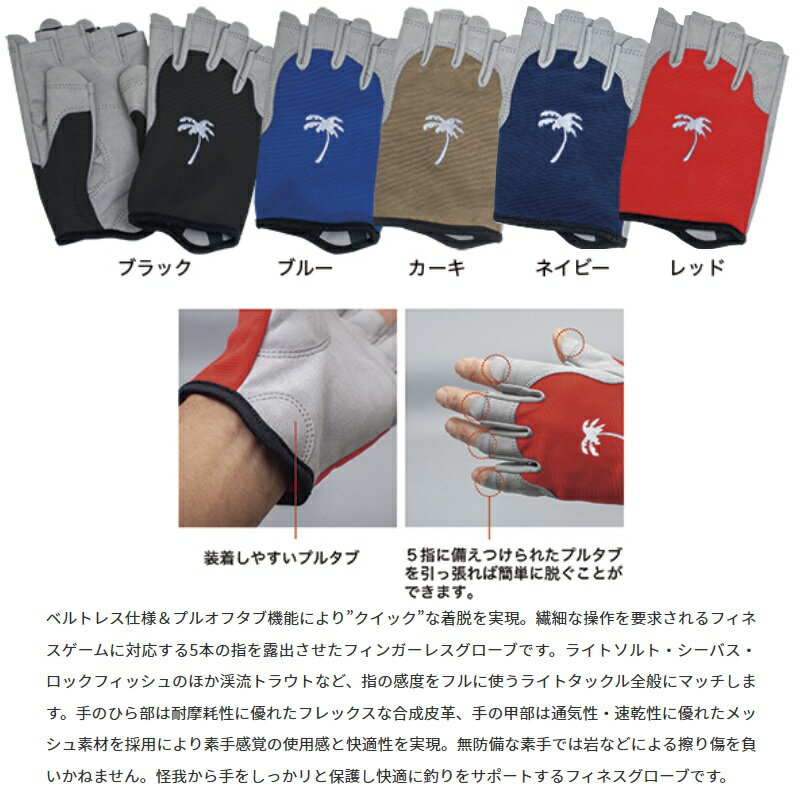 仕様表ベルトレス仕様&プルオフタブ機能によりクイックな着脱を実現。繊細な操作を要求されるフィネスゲームに対応する5本の指を露出させたフィンガーレスグローブです。ライトソルト・シーバス・ロックフィッシュのほか渓流トラウトなど、指の感度をフルに使うライトタックル全般にマッチします。手のひら部は耐摩耗性に優れたフレックスな合成皮革、手の甲部は通気性・速乾性に優れたメッシュ素材を採用により素手感覚の使用感と快適性を実現。無防備な素手では岩などによる擦り傷を負いかねません。怪我から手をしっかリと保護し快適に釣りをサポートするフィネスグローブです。Palms パームス クイックフィットフィネスグローブ●サイズ:L●カラー:カーキ詳細はこちら