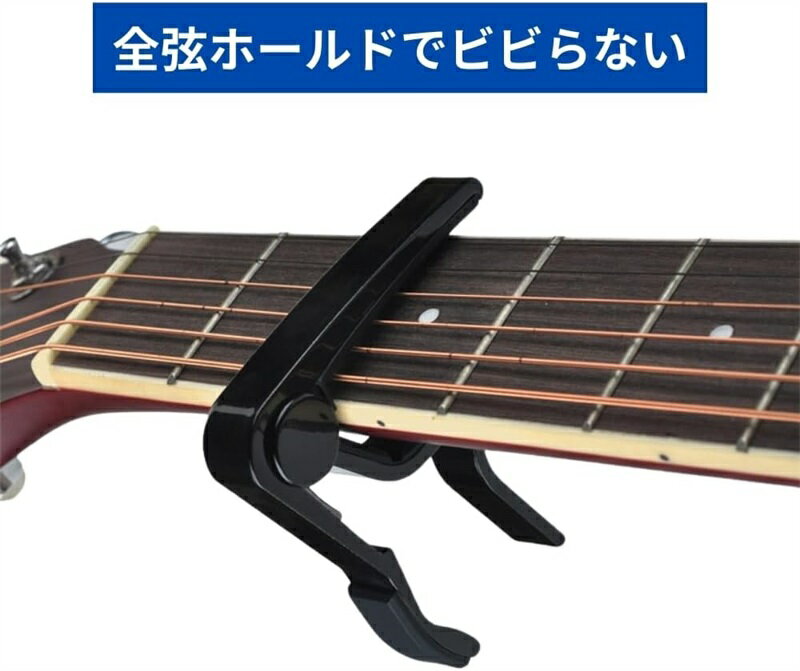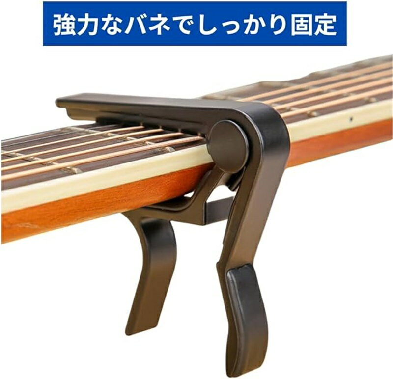 【高品質素材】 このカポタストは、アルミニウム合金を使用しており、軽量でありながら非常に耐久性があります。長時間の使用でも変形せず、しっかりとしたクランプ力を維持します。 【簡単操作】 片手で簡単に操作できるカポタストです。スムーズなスプリングアクションにより、素早くキーを変更でき、演奏中のストレスを軽減します。初心者からプロフェッショナルまで、どなたにもご利用いただけます。 【傷つけない設計】 シリコンパッドがネックと指板をしっかり保護し、ギターに傷をつけることなく、確実にフィットします。滑り止め効果もあり、演奏中にズレることがありません。 【多用途対応】 アコースティックギター、エレキギター、クラシックギターなど、さまざまなタイプのギターに対応しています。また、ウクレレやバンジョーなどの弦楽器にも使用可能です。幅広い楽器に対応する万能カポタストです。 【スタイリッシュなデザイン】 洗練されたデザインのカポタストで、演奏シーンに華を添えます。