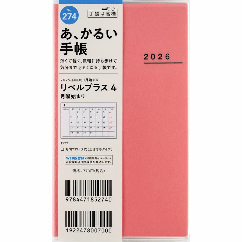 【メール便発送】高橋書店 2026年 手帳 No.274 リベルプラス4 手帳判 月間ブロック式 ドルチェ・ピーチ