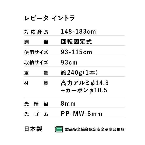 <<ご注意下さい>>こちらの商品はメーカーよりお客様へ直接お届けの品になります。 当店での在庫はしておりません。在庫の有無はメーカー在庫のみになりますので、急な欠品や急に廃盤になる可能性がございます。こちらの商品の配送について○北海道・沖縄・離島につきましては、配送不可となりますので予めご了承お願いします。こちらの商品の包装(ラッピング)について○上記の理由(メーカーより直送)により包装はできませんので予めご了承お願いします。こちらの商品の不具合について○お届けしましたこちらの商品に不具合があった場合、商品到着日より1週間以内に当店にご連絡ください。メーカーが直接対応させて頂きます。○お客様がご自身で修理された場合、費用の負担は致しかねますので予めご了承下さい。唯一のカーボンシャフト採用で、空気抵抗を抑える細身のスポーティな下段シャフトと、歩幅を広げる「しっかり歩けるグリップ」が相乗効果を生み、美しいフォームでのウォーキングをサポートします。【指導員におすすめ】SINANO製ウォーキングポール、唯一のカーボンシャフト採用モデル。空気抵抗を抑えるスポーティで細身な下段シャフトと、前傾を促し歩幅が広がりやすい「しっかり歩けるグリップ」の相乗効果で、より美しいフォームでのポールウォーキングへ導きます。SINANOスキーポールの往年の名機「イントラ」の名を冠した、ウォーキング機会の多いインストラクターの方にもきっと満足いただけるハイスペックモデルです。【軽量、高強度!高力アルミ×カーボン】上段には軽量な高力アルミ材、下段にはφ10.5mmのカーボンを採用。この設計から生まれる絶妙な重量バランスが、ポールを持った腕の振りを自然なカタチに促します。また、カーボン由来の軽さと強度だけでなく、その適度なしなりがウォーキング時の衝撃を吸収。手首、腕への負担を軽減するだけでなく、次の動きに移りやすいから、スムースなウォーキングが可能に。【100年の実績!日本製の高精度なサイズ固定機能採用】サイズ固定機能は、強度と精度が求められる競技用スキーポールの機構を採用。従来のウォーキングポールの回転固定機能に比べ、ガタつきをしっかりと抑えるだけでなく、より真っすぐにシャフトを保持可能に。この高精度なシャフト固定により、便利なサイズ伸縮機能付きポールでも、まるで一本モノのウォーキングポールのような使用感を実現いたしました。【消毒について】※アルコール消毒可能なグリップですが、アルコール消毒後はすぐに拭き取って下さい。変色・色落ちする可能性がございます。サイズ:使用サイズ:93〜115cm、収納サイズ:93cm個装サイズ:87×10×6cm重量:約240g(1本)個装重量:400g素材・材質:高力アルミφ14.3 + カーボンφ10.5仕様:製品安全協会認定安全基準合格品対応身長:148〜183cm調節:回転固定式先端径 :8mm先ゴム :PP-MW-8mm付属品:本体×2生産国:日本