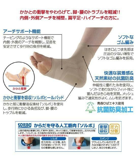<<ご注意下さい>>こちらの商品はメーカーよりお客様へ直接お届けの品になります。 当店での在庫はしておりません。在庫の有無はメーカー在庫のみになりますので、急な欠品や急に廃盤になる可能性がございます。こちらの商品の配送について○北海道・沖縄・離島につきましては、配送不可となりますので予めご了承お願いします。こちらの商品の包装(ラッピング)について○上記の理由(メーカーより直送)により包装はできませんので予めご了承お願いします。こちらの商品の不具合について○お届けしましたこちらの商品に不具合があった場合、商品到着日より1週間以内に当店にご連絡ください。メーカーが直接対応させて頂きます。○お客様がご自身で修理された場合、費用の負担は致しかねますので予めご了承下さい。医療現場から生まれた理想の衝撃吸収素材「ソルボ」を使用。テーピングのようなサポート機能で内側・外側のアーチを補整し、足首を安定させて、歩行時の負担を軽減します。------ ココがポイント! ------●ソルボパットが衝撃を吸収!●偏平足・ハイアーチの方の負担を抑えるアーチサポート機能付!●メッシュ編みで高通気性を確保。●はき口とつま先部はソフトなゴム編みを採用。●快適な装着感&天然素材の抗菌防臭加工済み。サイズ:S:22.0〜24.5cm個装サイズ:11.5×20.5×1.5cm重量:54g個装重量:62g素材・材質:本体:ナイロン・ポリウレタン、パッド(ソルボ):ポリウレタン・その他生産国:日本