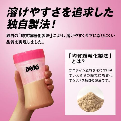 【商品特長】 ・「ザバス フォーウーマン シェイプ&ビューティー ミルクティー風味」は、大豆プロテインと運動でキレイに引き締めたい女性にうれしい成分を配合した粉末プロテイン。 ・引き締まったカラダづくりをサポートする「大豆プロテイン」と美容にうれしい「フィッシュコラーゲン」を配合しているので、健康的なキレイを目指すことができます。 ・運動する女性のカラダづくりをサポートする6種のビタミンB群とビタミンA、C、D、Eに加えて、カルシウム、鉄、マグネシウムを配合しています。 ・風味アップに加えて溶けやすさにこだわった当社独自の配合と造粒技術を活用しているので、シェイカーだけでなく、グラスやコップでも簡単に水に溶かせておいしく飲むことができます。 ・大豆の香ばしさが感じられる、すっきりとした甘さの飲みやすいミルクティー風味です。牛乳で溶かせば、まろやかなミルクティーのように召し上がれます。 ・商品につきまして問題がございましたら、お手数ですが下記までご連絡いただきますようお願いいたします。「株式会社 明治 お客様相談センター」 フリーダイヤル: 0120-858-660受付時間:9:00-17:00(土日祝日、年末年始除く) 【使用方法】 ・水または牛乳200mlに付属のスプーン3杯(約21g)を溶かしてお召し上がりください。 ・運動後、就寝前、朝食時がおすすめです。 ・初めての方や量が多いと思われる方などに:水または牛乳50-150mlに付属のスプーン1~2杯を溶かしてお召し上がりください。 ・溶かす飲み物の量は、お好みに応じて調整してください。 ・水または牛乳に溶かした後は速やかにお飲みください。 【使用上の注意】 ●あけくちや袋のはしで手を切るなどのケガをしないようご注意ください。 ●お湯又はあたたかい牛乳をシェイカーに入れてシェイクしないでください。水蒸気や内溶液がふき出し、やけどの原因になります。 ●体質や健康状態によって身体に合わないことがあります。その場合は、摂取を中止し、医師や専門家にご相談ください。 ●開封後はホコリや髪の毛が入らないようチャックをしっかりとしめ、温度や湿度の高い場所を避けて保管し、なるべく早めにお召し上がりください。 ●濡れたスプーンを袋の中に入れないでください。 ●製品中に色の濃い粒が見えることがあります。これは原材料の一部で品質には問題ありません。 【原材料・成分】 【原材料名】 脱脂大豆たんぱく(国内製造)、デキストリン、魚コラーゲンペプチド、紅茶エキスパウダー、食塩/炭酸Ca、炭酸Mg、増粘剤(プルラン)、カラメル色素、V.C、乳化剤、香料、甘味料(スクラロース、アスパルテーム・L-フェニルアラニン化合物、アセスルファムK)、ピロリン酸第二鉄、調味料(アミノ酸等)、V.E、V.B2、V.B6、パントテン酸Ca、V.B1、ナイアシン、V.A、V.D、V.B12、(一部に乳成分・大豆・ゼラチンを含む) 【栄養成分表示 1食分(21g)当たり】 エネルギー:77kcal、 たんぱく質:12.5g、 脂質:0.5g、 炭水化物:5.6g、 食塩相当量:0.30~0.73g、カルシウム:280mg、鉄:3.65mg、マグネシウム:50mg、ナイアシン:1.6~4.7mg、パントテン酸:0.46mg、ビタミンA:110~340?、ビタミンB1:0.50mg、 ビタミンB2:0.57mg、 ビタミンB6:0.42mg、ビタミンB12:0.08~0.25?、ビタミンC:32mg、 ビタミンD:9.1?、ビタミンE:0.95mg 【その他】 ※こちらの商品は予告なくパッケージが変更される場合がございます。 ※医薬品の商品は消費期限6か月以上のものを発送させて頂きます。 ※二個以上お買い求めの際、発送方法はスタッフがお客様のお住いの地域によって変更させていただく場合がございます。 ※複数の店舗で在庫を共有しておりますので、在庫切れの場合もございます。予めご了承ください。 【お問い合わせ先】 ※ザバスに関する詳細なお問合せは下記までお願いします 株式会社 明治 〒104-8002 東京都中央区京橋2-4-16 TEL 0120-858-660 【広告文責】 株式会社コスコ 電話:0263-87-9780