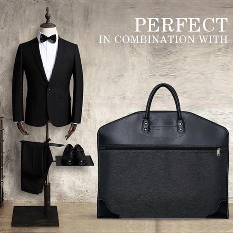 【防水素材】ガーメントバッグの生地にはPUレザーとオックスフォ一ド加工を施しました。撥水性・防汚性に優れた210d高密度オックスフォ一ドを採用して、降雨時の利用でも雨水等の生地への染み込みを抑制し、収納物を濡れから守ります。折り所とハンドルにもPUレザー加工を採用して、丈夫で長持ちできます。【大容量かつ軽量スーツ収納】完全オリジナル設計で、従来タイプのガーメントバックに比べて重量が比較的軽量に設計をされており、大きく使いやすいサイズなので、がっちり体形の方のスーツもしっかり収納可能。さらにバッグ外側にはファスナーポケットを設置して、スーツ、ワイシャツ、ビジネスマンに必要な資料などの収納に。【洗練されたオリジナルデザイン】高級感のある素材と洗練されたデザインで、ビジネスマンにぴったりのガーメントケース。スーツを二つ折りにするタイプなので、不自然なシワで困ることがありません。スーツはもちろん、ロングコートや着物、ワンピースなど長ものにも対応できます!。【多用途スーツバッグ】ビジネスシーンではもちろん、冠婚葬祭の際にも重宝すること間違いなし。2つ折りタイプなので丈のある長いものも収納でき、ご家庭にひとつあると男女問わず、シーンを選ばずにご利用いただけます。 サイズ F サイズについての説明 サイズ:約60*100cm 素材 ナイロン オックスフォード 色 ネイビー ブラック 備考 ●サイズ詳細等の測り方はスタッフ間で統一、徹底はしておりますが、実寸は商品によって若干の誤差(1cm〜3cm )がある場合がございますので、予めご了承ください。 ●商品の色は、撮影時の光や、お客様のモニターの色具合などにより、実際の商品と異なる場合がございます。あらかじめ、ご了承ください。 ●製品によっては、生地の特性上、洗濯時に縮む場合がございますので洗濯時はご注意下さいませ。 ▼色味の強い製品によっては他の衣類などに色移りする場合もございますので、速やかに(脱水、乾燥等)するようにお願いいたします。 ▼生地によっては摩擦や汗、雨などで濡れた時は、他の製品に移染する恐れがございますので、着用の際はご注意下さい。 ▼生地の特性上、やや匂いが強く感じられるものもございます。数日のご使用や陰干しなどで気になる匂いはほとんど感じられなくなります。