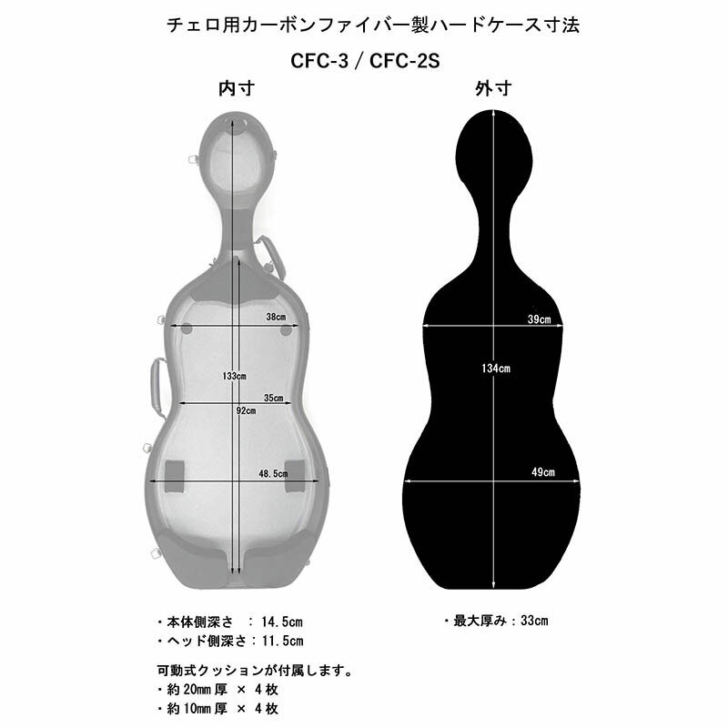 「新素材カーボンコンポジット」採用により、価格を抑えたハイコストパフォーマンスモデル。頑丈、軽量、使いやすさにこだわったチェロケースです。■新素材のカーボンコンポジットを採用し、価格を抑えたハイコストパフォーマンスモデルです。■内装は人気のチェロケースCFC-3と同様で、CFC-2Sはサテン仕上げのみのラインナップ。■重量は約3.6kg(※別途 ストラップ0.3kg)。■CFC-3(約3.5kg)に比べ少しだけ重くはなっておりますが、使いやすさ(素材・重さ以外の仕様)はCFC-3と同様です。■剛性も良く、そのうえ軽量なコストパフォーマンスに優れたチェロケースです。(重さは生産時の塗装の厚さにより多少前後することがあります。)重量3.6kg (※別途ストラップ 0.3kg)※リュック可