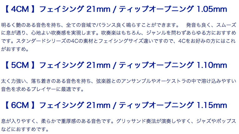 最新モデルチェンジ後の新タイプです。 外径の拡大、「JAPAN」の刻印がなくなりました。 内径の変更はありませんが、新しいリガチャーとキャップのご使用をおすすめします。 【 5CM 】フェイシング 21mm / ティップオープニング 1.10mm太く力強い、落ち着きのある音色を持ち、弦楽器とのアンサンブルやオーケストラの中で溶け込みやすい音色を求めるプレイヤーに最適です。 YAMAHA clarinet mouthpieces custom ヤマハ クラリネットマウスピース カスタム ■ラインナップ:CL-4CM、CL-5CM、CL-6CM ■ Bフラット クラリネット、Aクラリネット兼用 ■フェイシング:19mm ■ティップオープニング:4CMが1.05mm、5CMが1.10mm、6CMが1.15mm ■素材:エボナイト製※細かい仕様が画像と変わる場合がございます。 〜以下他ラインナップの仕様と特徴〜 【 4CM 】フェイシング 21mm / ティップオープニング 1.05mm 明るく艶のある音色を持ち 全ての音域でバランス良く鳴らすことができます。発音も良く スムーズに息が通り 心地よい吹奏感を実現。吹奏楽はもちろん ジャンルを問わずあらゆる方におすすめ。 明るく艶のある音色を持ち、全ての音域でバランス良く鳴らすことができます。 発音も良く、スムーズに息が通り、心地よい吹奏感を実現します。吹奏 楽はもち ろん、ジャンルを問わずあらゆる方におすすめです。スタンダードシリーズの4Cの素材とフェイシングサイズ違いですので、4Cをお好みの方にはこれがおす すめ。 ヤマハカスタムクラリネットの殆どがこの4CMが付属しています。 付 属楽器モデル例:YCL-851II、YCL-852II、YCL-842II、YCL-853II、YCL-843II、YCL-852IIV、 YCL-842IIV、YCL-853IIV、YCL-843IIV、YCL-CSV master、YCL-CSV masterA、YCL-SEV master、YCL-SEV masterA、YCL-Ideal G、YCL-Ideal GA、YCL-SE artist model、YCL-SE artist modelA など 【 6CM 】フェイシング 21mm / ティップオープニング 1.15mm 息が入りやすく、柔らかで重厚感のある音色です。グリッサンド奏法が演奏しやすく、ジャズやポップスなどにおすすめです。 良い状態のマウスピースは上達への早道です。 楽器をはじめて数年...マウスピースを変えたことがありますか? 「使えるからいい」と長年同じマウスピースを使用し続けている方も多くおられます。学生さんをはじめ、熟練の方まで、意外とお気に入りのマウスピースを使い続けている方が多いですね。 さて、何故長く同じマウスピースを使い続けることが良くないかというと...☆手持ちのマウスピースのここをチェック☆・先端(ティップ):欠けたり、傷が付いていたりしませんか?こすれたり、ちょっとの欠けがあったらリードが十分に振動しません。 ・先端内側(ティップレール)のエッジ:長年スワブを通していると、少しづつ角がすり減って丸くなっていきます。ぱっと見はわかりにくいかもしれません。マウスピースにスワブを毎回通している方は、新しいマウスピースに買い換えたら、スワブを通す回数を減らし、演奏後は清潔に水を通してやわらかい布で拭き取るお手入れを取り入れていきましょうね。 ・先端内側(ティップレール)のサイドレール:リードが一番接触する面です。これは正しくお手入れ/使用しても、長年のうちに少しづつすり減ってしまうことは仕方ありません。新品のときとリードの振動が変わってしまうのは残念ながら避けられないことなのです。 ・先端外部(ビーク):前歯の当たる部分です。マウスピースパッチを貼っている方も、そのまま使用している方もボコボコに凹んでいたり、えぐれたりしている方がおられます。こうなってしまうとアンブシュアを安定させることが困難になります。 ・接合部のコルク:バレルとの接合部です。セッティングの際には毎回抜き差しする場所ですので、劣化は見て取れることだと思います。買いたてはグリスを塗っても入りにくかったものが、いつのまにか軽く入るようになっていませんか?ここはアンブシュアの安定、場合によっては十分な気密性を保てなくなるのです。音漏れ、ピッチは管楽器には重要ですよね。 さて、これらのチェックポイントをクリアしても、まだまだ買い換えが必要なワケがあるのです。 自分の演奏力を最大限に発揮するマウスピース、「今の状態」がベストで吹きやすい。そういう方、おられると思います。自分のクセに馴染み、マウスピースに慣れ、吹きやすくなっている今の状態。実はこれ、そのマウスピースに自分が対応していっているんですね。このまま使用し続ければどうなるでしょう。破損してしまえば、買い換えは免れないわけですから、そのときに【新しいマウスピース】=【いたってスタンダードなアンブシュア】で演奏できない(しにくい)ということになりかねません。定期的に新しいものに変えることで、正しいアンブシュアを常に意識し、基本からの応用に対応できるのです。 では次にどのようなマウスピースを選べばよいかということになります。お手入れ用品、アクセサリー類、リードは結構頻繁に新しいものを購入されているかと思いますが、各部品は購