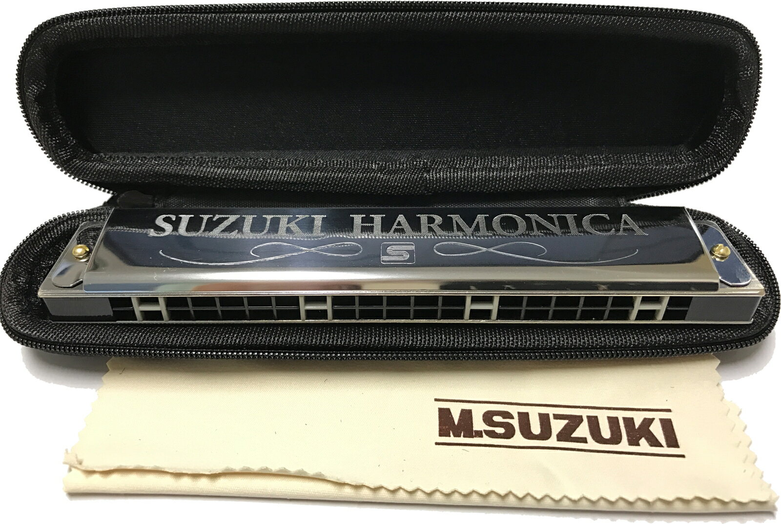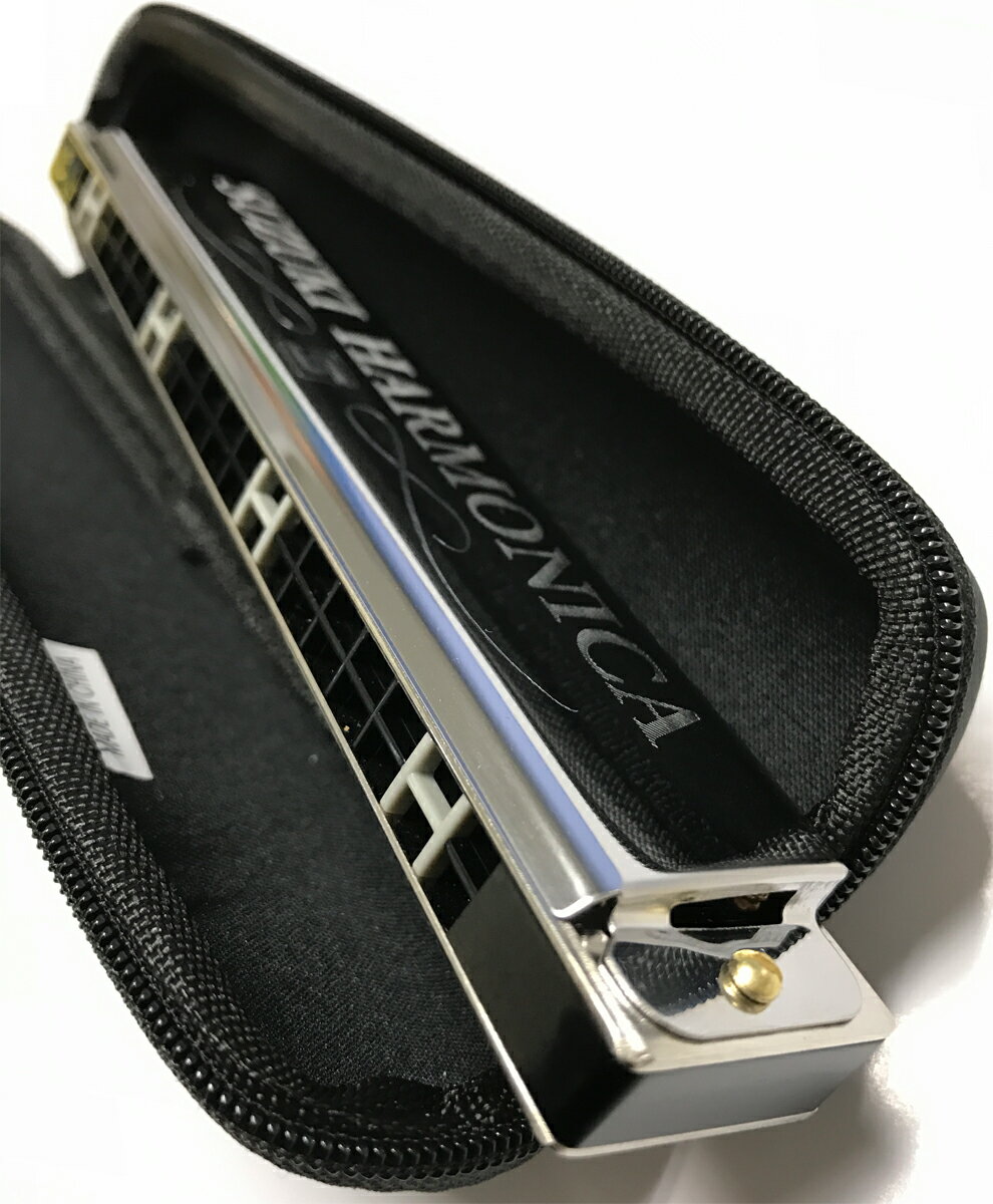 こちらは【マイナー Gm調】です。 2018年これまでのSU-21SPが販売停止になり、2019年2月SU-21SP-Nとなりリニューアルしました。 ハーモニカのデザイン、吹きやすさは基本的に変更がありません。ケースはベージュ(肌色)のハードケースから、ゴム(?)っぽい表面のセミハードケースに変更になりました。これでハーモニカが中でカタカタと動くこともなくなり安心です。 スズキスペシャルは鈴木楽器の複音ハーモニカで一番お安い定番の入門用モデルとして長くご愛用者の多いハーモニカです。扱い安くコストパフォーマンスの高さが魅力です。 ハーモニカには種類があります。こちらは古くから日本で愛用されるハーモニカとして、いわゆる「複音ハーモニカ」と呼ばれる楽器です。 おじいちゃん、おばあちゃん世代が昔を懐かしみ手にされるのがこのモデルが多く、昭和の後期から現代の幼稚園、小学校教育で使用されるハーモニカはこれとは違うと思います。 教育用ハーモニカは右にいくと音階が上がり「ラシド」の音階が「吹吸吸」となっていると言えば思い出す方も多いかもしれません。 こちらの複音ハーモニカはそのような配列になっていないのも1つの特徴です。複音ハーモニカのその独特の配列こそが昔を思い出して探り吹きをされる方には重要な要素かもしれません。 複音ハーモニカはトレモロハーモニカと呼ばれ、その音色に大きな特徴があります。複音という言葉通り、複数の音が同時になるダブルリードのハーモニカです。 しかしながら「ダブルリード」のハーモニカにも実は色々あります。 ダブルリードのハーモニカは上下2段の見た目になっているものがほとんどですが、その2段を同時に吹くから同時に複数の音が奏でられるのです。 その複数の音には若干の違いがあり、上下が1オクターブ違うものは複音ハーモニカの中でも「オクターブハーモニカ」と呼ばれるものになります。 こちらはオクターブではなく、言うなれば「同じ音階」を若干ピッチをずらして上下にセットしてあります。 それによって「トレモロ」の効果が得られるのが、この複音ハーモニカの特徴です。演歌など哀愁漂う音質はポップスやジャズなどでよく使われる10穴のブルースハーモニカでは得ることはできません。 情緒豊かなアコーディオンのような重厚な美しい音がでます。 ブルースハーモニカなどはアコギなどで弾き語りをするゆず、長渕剛などが有名ですが、複音ハーモニカは独奏も多くそもそも単音ではありませんので、1人での演奏でも音圧もあると思います。 また、複音ハーモニカはいろいろな奏法で演奏もでき、その独自の配列がそこにも生かされてきます。 当然練習が必要になる奏法ですが、ビブラート奏法、バイオリン奏法、ベース奏法など色々な奏法があり、1人で演奏しているにも関わらずあたかも複数の人と演奏しているような演奏ができます。 その技術も安定した音程と美しい音があってこそ生かされるものです。ハーモニカは小さな楽器ですので部品の1つ1つに高い精度が求められるとても繊細な楽器です。 以前のモデルSU-21SPは日本製でしたが、このリニューアルモデルは中国製になりました。 長期出荷停止になりコストがきっとあがったのでしょう...ですが、定価は変わりません。中国製といえども日本のハーモニカメーカーの製品クオリティーはとても高くパーツやアフターケアも充実しています。 ただ、リードプレートなどの研磨キズなどは若干気になりますね...。 ハーモニカを選ぶ際にもう1つ気にしておくべきことがあります。 「調子」です。 以前のモデルではメジャーマイナー共に24調子ありましたが、リニューアルモデルでは調子が減りました。 導入モデルですので、そういった意味でも最低限この調子を入門者としては持っておくと良いということになります。どれを選べばいいか分からないという悩みを持つ方が多くおられると思いますので、そういった意味では選びやすくなりましたね。 吹く曲がきまっていない、何も分からない、とりあえず1本目という方は「C調」がおすすめです。 教本の多くもC調を使う場合が多いです。日本の童謡などの曲もC調を使う曲が多いです。 C調とはなにか、分からない方に簡単に説明しますと、C調のハーモニカはピアノでいう白鍵の部分だと考えます。C調では黒鍵の音階が出ません。ですので、楽譜に♯(シャープ)、♭(フラット)のある音が出ないということです。 さらに、そのC調に対してのピアノでいう黒鍵部分の音階が入ったハーモニカが「C♯調」のハーモニカです。 こちらも難易度が上がり裏技的ではありますがC調とC♯調を2本同時に持ち、C調にない音をC♯調で補って演奏する方法もあります。 ですが、そもそも調子が分かれている楽器です。分かれているには意味があり、違う調子を持つハーモニカで演奏した場合に吸音ばかりになって演奏が辛かったり、穴飛びが多くて早く音の移動ができなかったりということが出てくるわけで