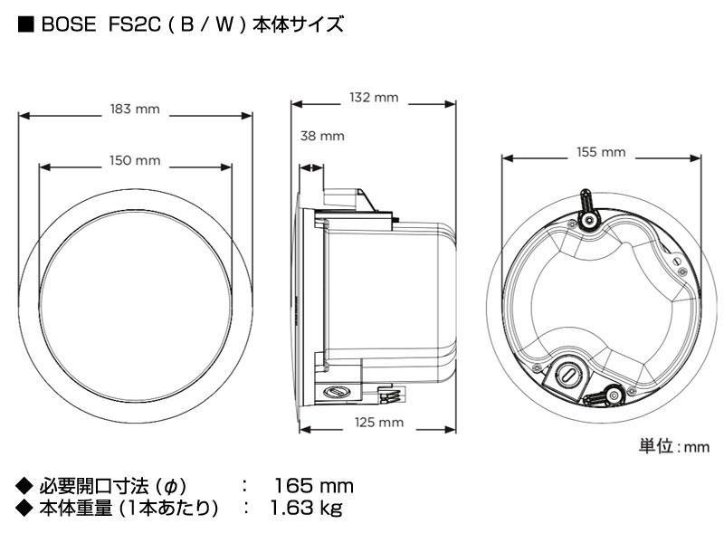 《 BOSEで揃える! シーリングスピーカー セット 》天井埋込型スピーカー 4台 とアンプのセット ◆ 天井埋め込み スピーカー 4台とパワーアンプの定番セットです。[ 商品説明 ] 自宅のリビングやキッチン、お店やショールームなどの商業施設にお勧めです。 スッキリしたデザインのオシャレなスピーカーからBOSEがデザインする本格的なサウンドで空間を演出。 パワーアンプのスピーカー出力が2系統あり、それぞれのスピーカー出力に2台ずつ接続する基本セットになります。 音声のステレオ/モノラルはパワーアンプの設定で切り替え可能。 またBOSE FS2 / FS4 と IZA250-LZ v2の組みわせはパワーアンプに搭載したイコライジング(EQ)でBOSEが提唱すサウンドデザインを呼び出すことが可能です。 ◆ ボーズ FS2CW 2ペア ( 4台 ) 天井埋込 ローインピ BGMセット( IZA250-LZ v2) [ セット内容 ] ◆ スピーカー BOSE FS2CW(ホワイト / 白色) x 2ペア(計4本) ◆ パワーアンプ BOSE FreeSpace IZA250-LZ v2 x 1台 ◆ セットの内容や設定について スピーカーは全て ローインピーダンス接続(16Ω)で設定、配線を行うセットです。 パワーアンプはローインピーダンス接続専用です。 パワーアンプからスピーカーまでのスピーカーケーブル(別売)の長さは20メートル以下の環境でご利用いただけます。 パワーアンプ 背面のEQ設定を『FS2』に設定いただくことでイコライジングを呼び出すことができ、BOSEが設定、デザインした FS2 のサウンドをお楽しみいただくことができます。 ステレオ再生とモノラル再生を切り替えることが可能です。 ※ 接続ケーブルなどは別途ご用意ください。 ※ 取付・施工代金などは含まれません。 ※ スピーカーの許容入力内で過大入力にならないようにご使用ください。 ※ BGM再生を目的としたセットです。マイクを使用した音声を入力する場合、音量によってはスピーカーの音が割れる場合があります。 ※ アナウンスや歌唱を目的とした用途の場合は BOSE FS4を含むセットをご購入ください。 《 天井埋め込み スピーカー 》FS2C W ( ペア / 2本入 ) 白 ホワイト BOSE FS2CWはボーズの定評あるBGMスピーカーシステムの天井埋め込み型スピーカーです。 BGMスピーカーの定番だった旧モデルのDS16FW からサウンド、デザイン、耐久性、設置の簡易性を一新しました。 ボーズ FS2CWは 新シリーズとなる「FreeSpace FS」シリーズ最小の埋め込みスピーカーで均一な音質を提供します。 FreeSpace FSは、BGM再生の用途で高品質のパフォーマンスを実現。あらゆる商業空間に最適です。 ハイインピーダンス接続(100V/70V)およびローインピーダンス接続に対応しています。 パフォーマンスとコストを完璧なバランスで実現するFreeSpace FSは、固定設備用に均一で高品質なサウンドをお求めの方に最適です。 ・2.25インチフルレンジトランスデューサー 16Ωおよび70/100 Vでの動作 ・フロントバッフルのタップ設定。フロントバッフルからオーディオを接続 ・均一な音質 : すべてのFSモデルで均一な音質を提供 ・音楽も音声も最高の音質で : クリアな音声とBGMの滑らかなレスポンスを実現するトランスデューサーを搭載 ・さまざまなインテリアに溶け込むデザイン ・取り外し可能ロゴ ・あらゆるニーズに対応 : 幅広い用途や取り付けオプションに対応した、豊富なアクセサリーをご用意 ・簡単に取り付け可能 : ユーロブロック入力を装備。 ・天井埋め込み型モデル : フロントバッフルに入力を配置しています ・公共の安全規格に対応 : すべてのモデルがUL 1480 ULC-S541規格に準拠し、安全を守る火災報知や警報システムに対応しています □主要な仕様 ◆ スピーカー : 5.7cm フルレンジ 1基 ◆ 許容入力 : 16 W ◆ ロー / ハイインピーダンス両対応 ・ローインピーダンス : 公称 16Ω ・ハイインピーダンス : 100V伝送: 2, 4, 8, 16 W, バイパス 、 70V伝送: 1, 2, 4, 8, 16 W, バイパス ◆ 必要開口寸法 (φ) : 165 mm ◆ 本体 外形寸法 : 183(直径) × 132 (奥行) mm ◆ 本体重量 (1本あたり) : 1.63 kg 《 パワーアンプ 》BOSE ( ボーズ ) FreeSpace IZA250-LZ v2 ◆ パワーアンプ IZA 250-LZ v2は、店舗、レストラン、オフィスや会議室などの商業・公共施設においてプレミアムサウンドを提供するコンパクトミキサーパワーアンプです。FS2 / FS4 スピーカーをベストドライブする専用EQを内蔵し、シンプルなセットアップと簡単操作を実現。スピーカー増設にも柔軟に対応できる拡張性も兼ね備えています。 ■主な仕様 ◆ 定格出力: 2ch x 50W (4Ω) 、 2ch x 25W (8Ω) ※16Ωの駆動にも対応します ◆ BOSE スピーカー FS2 / FS4 スピーカーをベストドライブするEQ(イコライジング)プリセットを搭載 専用EQ対応モデル:FS2C W / FS2C B / FS2SE W / FS2SE B / FS2P W / FS2P B FS4CE W / FS4CE B / FS4SE W / FS4SE B ◆ 外形寸法 / 質量:214(W) X 45(H) X 310(D) mm / 2kg ※FSシリーズスピーカ(FS2/FS4)のイコライザープリセットが搭載されているv2(バージョン2)です