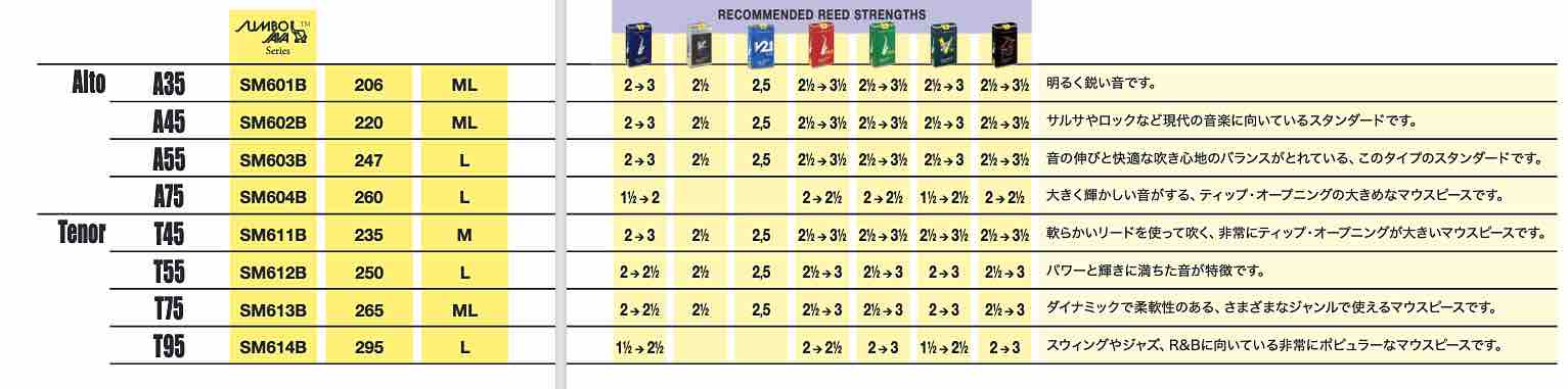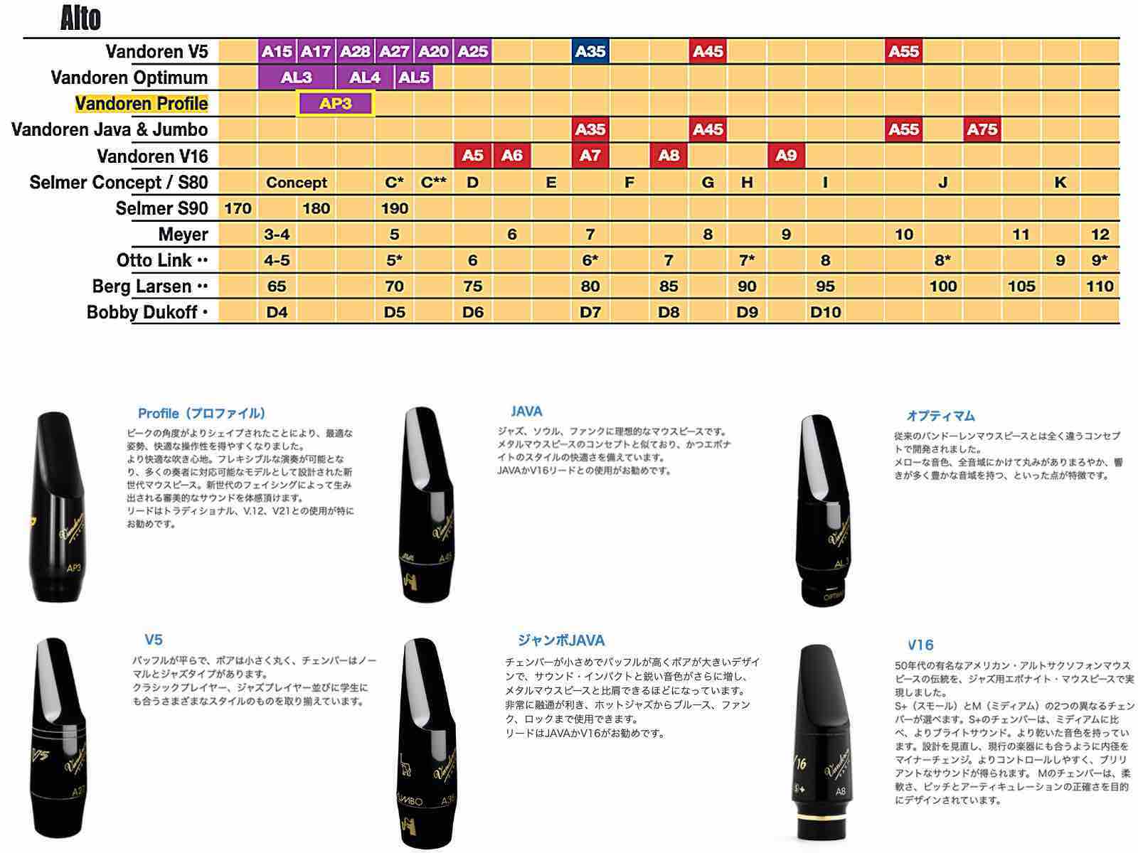 ▼アルトサックス シリーズラインナップ ・V5...チェンバーが伝統的な丸い形になっています。バッフルが平らで、ボアは小さく丸く、チェンバーはノーマル(V5)とジャズタイプ(V5JAZZ)があります。 クラシックプレイヤー、ジャズプレイヤー並びに学生にも合うさまざまなスタイルのものを取り揃えています。 ・PROFILE...ビークの角度がよりシェイプされたことにより、最適な姿勢、快適な操作性を得やすくなりました。 より快適な吹き心地。フレキシブルな演奏が可能となり、多くの奏者に対応可能なモデルとして設計された新世代マウスピース。新世代のフェイシングによって生み出される審美的なサウンドを体感頂けます。 リードはトラディショナル、V.12、V21との使用が特にお勧めです。 ・Optimum...従来のバンドーレンマウスピースとは全く違うコンセプトで開発されました。 メローな音色、全音域にかけて丸みがありまろやか、響きが多く豊かな音域を持つ、といった点が特徴です。 ・V16...ジャズの新たなスタンダード。50年代の有名なアメリカン・アルトサクソフォンマウスピースの伝統を、ジャズ用エボナイト・マウスピースで実現しました。テナーサックス一部のティップオープニングに大きく豊かでよりダークなサウンドが得られるようLチェンバーが登場。 JAVA、V16、そしてZZのリードにマッチするマウスピースです。バリトン・マウスピースの長い伝統に培われ製作されました。・JAVA...ジャズ、ソウル、ファンクに理想的なマウスピースです。メタルマウスピースのコンセプトと似ており、かつエボナイトのスタイルの快適さを備えています。JAVAかV16のリードとの使用がおすすめです。・ジャンボJAVA...チェンバーが小さめでバッフルが高くボアが大きいデザインで、サウンド・インパクトと鋭い音色がさらに増し、メタルマウスピースと比肩できるほどになっています。非常に融通が利き、ホットジャズからブルース、ファンク、ロックまで使用できます。リードはJAVAかV16がおすすめです。▼JUMBO JAVAのシリーズラインナップモデル名・品番・TIP OPENING 1/100mm・FACING LENGTH A35 SM601B 206 ML 明るく鋭い音です。 A45 SM602B 220 ML サルサやロックなど現代の音楽に向いているスタンダードです。 A55 SM603B 247 L 音の伸びと快適な吹き心地のバランスがとれている、このタイプのスタンダードです。 A75 SM604B 260 L 大きく輝かしい音がする、開きの大きめなマウスピースです。▼マウスピースを選ぶ際のポイント マウスピースを購入される上で選ぶ要素はたくさんあると思います。以下の項目は比較的メーカーが数値などを出していることが多いのでぜひ確認してみてください! ■材質 ハードラバー (エボナイト )、メタル、(ブラス、ステンレス、ブロンズ)、合成樹脂(プラスチック)、クリスタルなどがあり、この材質の違いがサウンド全体に影響します。一般的に、ハードラバーは温かく太い響きで、メタルは明るく輪郭がはっきりとした音質という傾向があります。 メタル製は表面仕上げのメッキなどによっても音色に影響を与えます。 ■ティップオープニング リードとマウスピースの先端の開きを指し、必要な息の量や音量に影響を与えます。 ・開きが広い...豊かでパワフルなサウンドな傾向。狭いものより息の量が必要です。表現の柔軟性は高いですが慣れていないと音をコントロールしきれないこともあるので要注意です。 ・開きが狭い...明るい響きな傾向。少ない息で効率よく鳴らせる。表現の柔軟性は劣りますが音程のコントロールがしやすく安定性があるので初心者の方は狭いものから始めるといいかもしれません。■フェイシング マウスピースの先端からリードが接するところまでの長さを指します。リードが振幅する部分で吹奏感や音の反応に影響をします。 メーカー、ブランドによって表記の仕方が変わりますが多くはS(ショート)、M(ミディアム)、L(ロング)などと表記されることが多いです。 短いものは明るくクリアで、長くなるにつれダークで柔らかいサウンドが得られます。この長さに加えてカーブの角度や形状によっても変わります。 vandoren JUMBO JAVA Alto saxophone mouthpieces バンドーレン アルトサクソフォン用 マウスピース ジャンボJAVA ・ジャンボJAVAシリーズ チェンバーが小さめでバッフルが高くボアが大きいデザインで、サウンド・インパクトと鋭い音色がさらに増し、メタルマウスピースと比肩できるほどになっています。非常に融通が利き、ホットジャズからブルース、ファンク、ロックまで使用できます。リードはJAVAかV16がおすすめです。 ■管楽器 木管楽器 アクセサリー ■シリーズ:ジャンボJAVAシリーズ ■モデル:A55 ■品番:SM603B ■black ebonite ブラック ■特徴:音の伸びと快適な吹き心地のバランスがとれている、このタイプのスタンダードです。 ■ティップオープニング:247mm ■FACING LENGTH:L ※おおよそ多くのアルトサックス対し相互性がございますが、一部の商品についてはコルク部分を削るなど