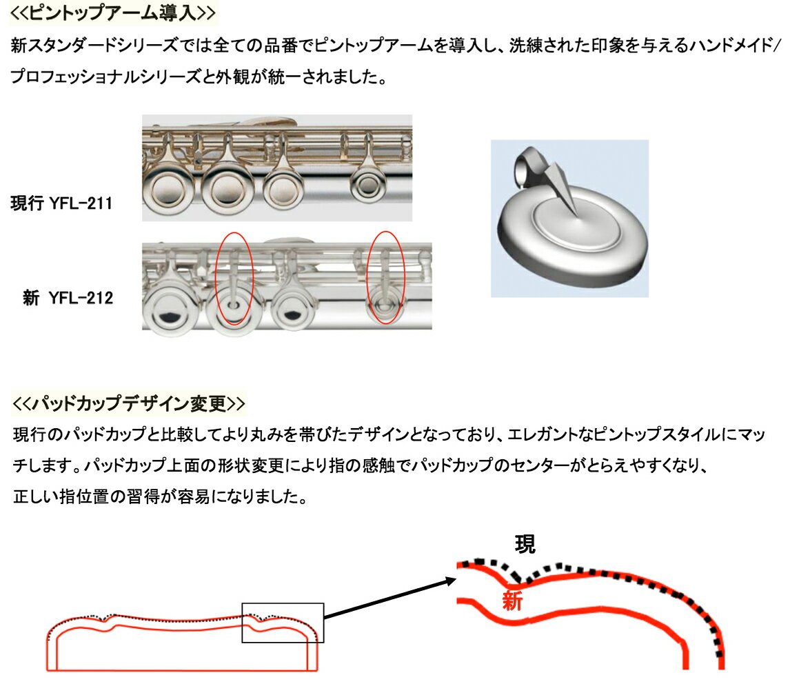 フルートは保管による状態変化がある楽器のため出荷前に技術者調整を行います。YFL-411の後継モデルでYFL-212 (YFL-211) の【頭部管 銀製】、YFL-312 (YFL-311)の【管体 銀製】のものが、こちらのYFL-412です。頭部管と管体パイプを銀製とすることで限りなく総銀製に近づけた、より豊かで温もりのある響きが魅力。音色の変化がつけやすく多彩な表現が可能です。演奏者のデリケートな要求にもしっかりと応えます。 現行品 最新モデル 以下が旧モデルからの変更内容の一部です。(旧モデル品番YFL-411) ・ピントップアーム...上位モデルであるプロフェッショナル、ハンドメイドシリーズと同様のキイの接合部の形状です。 ・パッドカップデザイン...丸みを帯びたデザインで正しい位置に指がフィットしやすいカップとともに、陰影に富んだエレガントなヨーロッパスタイルが魅力。 ・タンポ調整台紙..こちらも上位モデルであるプロフェッショナルモデル/ハンドメイドモデルで使用されているより精密な調整が可能なシムペーパー採用。 ▼ヤマハ フルートラインナップ フルートのメカニカルオプション以外の価格の違いは、主に素材であり、それぞれ材質ごとに異なる音の特性を持っています。低価格の一般的な製品は大部分が白銅が用いられており、上位モデルにいくほど口元に近い部分から銀の範囲が広がっていきます。スタンダードシリーズ すべてCY頭部管となっており、素材を除き管体のつくりは基本同じです。 200シリーズ...吹きやすさを重視した初心者導入モデル。洋銀、白銅製が主。U字管やリングキイモデルもリーズナブルにご購入いただけます。YFL-212、YFL-212LRS、YFL-212U 300シリーズ...頭部管が銀製になるなど、吹きやすさの中にも奏者のレベルに応えることもできる仕様に。リングキイなどラインナップ豊富。YFL-312、YFL-372、YFL-382 400シリーズ...管体も銀製になり、より本格的な演奏力にも応えられる仕様でかつお値段はまだリーズナブル。YFL-412プロフェッショナルシリーズ フィネス 上位モデルであるハンドメイドフルート"イデアル"の仕様や演奏性を継承したシリーズで、発音性の良さはもちろん深みのある音色が魅力です。このシリーズはスタンダードシリーズとまず管体のつくりや頭部管のつくりが異なっています。 500シリーズ...頭部管が銀製。リングキイ、H管などもあり。YFL-517、YFL-577、YFL-587、YFL-597 600シリーズ...頭部管+主管/足部管が銀製。リングキイ、H管などもあり。YFL-617、YFL-677、YFL-677、YFL-687、YFL-697 700シリーズ...頭部管+主管/足部管+キイが銀製。リングキイ、H管などもあり。YFL-717、YFL-777、YFL-787、YFL-797ハンドメイドシリーズ(800、900シリーズ) ハンドメイド木製 ハンドメイドコンセプトモデル...メルヴェイユ、ビジュー ハンドメイド イデアル...シルバー(銀製)、ゴールド(金製)▼スタンダードシリーズ ・YFL-212...白銅 ・YFL-212LRS...白銅+銀製(リップ/ライザー) ・YFL-312...白銅+銀製(頭部管) ・YFL-412...白銅+銀製(頭部管+主管) ▼EメカニズムについてEメカニズムはフルートの構造上、出しづらい音を発音しやすくするためのキイシステム。特に難しいとされる第3オクターブの「ミ」 (E音)が出しやすくなります。練習でどうにかなると思いきや古典派やロマン派、 現代曲の技術的に高度な楽曲にも多用されスムーズな演奏には有効なシステムといえます。フランスでは一部のプロ以外はあまり使っていませんがドイツ、日本ではごく一般的な機能として認識されています。Eメカ無しのメリットとして音色が比較的明るくなることです。一般的にEメカ付きが値段が高いですが音色の面で言うとどちらが好きかは好みにもよります。インラインのフルートにそのままEメカを付けるとキイの動作に不具合が出やすくなることからインラインには標準装備されていないものも多くインラインにはEメカがないのが一般的な面もあります。▼キイタイプ ・カバードキイ...キイに穴があいていないもの。キイが孔を確実に押さえ、息の漏れを防ぐ。初心者やこれからはじめる方に多くはこちらを使用。 ・リングキイ...キイに穴があいているもの。リング状のため孔を確実に押さえるのに技術が必要。指先に空気の振動を直接感じることができ、細やかな響きのニュアンスをコントロールすることが可能になる。グリッサンドなどの特殊奏法も可能にします。 ・オフセット...左手薬指で操作するGキイがせり出し、指の長さに合った配列により自然で押さえやすい。 ・インラインキイ...主管のキイが一直線に配列されている。リングキイモデルではどちらかというとインラインの方が主流になります。▼素材とメッキの違い 安いフルートは主に洋白(白銅)を素材としており、上位モデルにいくほど銀を使用している部分が多くなります。シリーズのラインナップによって使われる銀の部分が多くなるのがお分かりいただけるかと思います。素材、メッキは音を出す上で大きな影響があるもので、さらに口元に近い部分はよりその影響が強