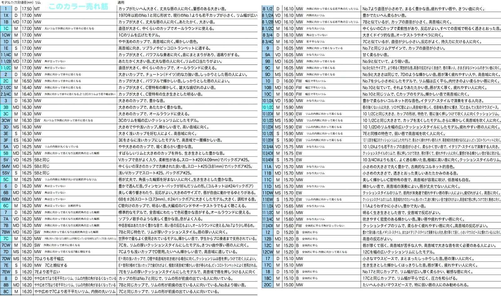 ▼Bachコルネットマウスピースシリーズ■スタンダード 世界中でプロフェッショナルから初心者まで最もよく使われています。貧弱な楽器をレベルアップさせ、良い楽器はいっそう良くなります。豊かな音量でイントネーションに優れ、高い音から低い音まで反応がよく、響きが豊かで全音域にわたって音の粒が揃い、適度な抵抗が疲労を防ぎます。 ■アルティザン 1920年代からのデザインに基づいて開発されたアルティザン・トランペットの成功に喚起され、実現されました。アルティザン・マウスピースの形やトーン、レスポンスは、初期のバックマウスピースを彷彿とさせるものです。トランペットは1920年代初頭のデザインをモデルに、コルネットはヴィンセント・バックが個人的に好きだった1950年代中頃をモデルにして、特別に選択されたスロートとバックボアを用い、当時の特徴を再現しています。世界中でプロフェッショナルから初心者まで最もよく使われています■メガトーン 分厚く力強い音色を得たいという多くのトランペットプレイヤーからのニーズに応え開発されました。マウスピース外側の質量を倍以上に増しスロートも若干太くすることで、抵抗感が少なくコントロールしやすい、深みのある音色を実現。ppからffまで全音域で幅広いダイナミックレンジを持ち、歪むこともなく、あたたかみのある力強いサウンドをもたらします。 Vincent Bach MOUTHPIECES ヴィンセント バック マウスピース ■スタンダード...世界中でプロフェッショナルから初心者まで最もよく使われています。貧弱な楽器をレベルアップさせ、良い楽器はいっそう良くなります。豊かな音量でイントネーションに優れ、高い音から低い音まで反応がよく、響きが豊かで全音域にわたって音の粒が揃い、適度な抵抗が疲労を防ぎます。【楽器】CORNET コルネット 【シリーズ】 STANDARD スタンダード 【モデル】3CW 【カップ】C 中くらいのカップで多くの人が好むタイプです。また、B♭、C、Dトランペットを持ち替える人にも好まれています。(No.10 バックボア) Wモデルは広いクッションリムで柔らかくて厚い唇の人に向いています。 【カップ深さ】 M...普通 【直径】 16.30mm 【リム】 SW 丸いリムで外側に向かって徐々に低くなる。 【仕上げ】 銀メッキ仕上げ 【特徴】3Cのリムを幅の広いクッションリムにしたモデル。 ☆数字はカップの直径の大小を表します。数字が大きくなるほどカップの直径は小さくなります。 ☆数字の後のアルファベットはカップの種類を表しています。アルファベットが付かないモデルも存在します。※細かい仕様が画像と異なる場合がございます。また全てのメーカー、全ての型番のコルネットに装着ができる訳ではございません。装着について返品/交換はできません。 ●リム厚さ 厚いリムは、唇の支持面積が広 くなるため高音域が容易となり長時間の演奏が可 能になりますが、唇の自由度が制限される分、柔軟性が失われます。反対に薄いリムは、音のコントロールは容易になり幅広い音域をカバーできますが、リムが 唇に食い込んでしまうと疲れやすくなる傾向があります。一般的に初心者は中庸な厚さのリムを選択することが無難ですが、個人差もありますので、違和感がな く、自然に楽に演奏でき疲れにくいタイプを選んでください。 ●リム内径 リム内径は小さいほど、高音域の演奏が容易で耐久性に優れていますが、音量は小さくなります。逆に大きいほど、低音域が容易で音量も増えますが、耐久性は劣 るようになります。一般にシンフォニーオーケストラのプレイヤーは大きいサイズを好み、吹奏楽は中庸、ジャズのビッグバンド奏者は小さいサイズを使用する 傾向があります。しかし、最初から高音域出したいために極端に小さいサイズを使用すると、マウスピースを無理に押しつけて高音を出す誤った奏法を身につけ てしまう恐れがありますので、注意を要します。 *“リム内径の大きなマウスピースを使ってい る奏者ほど上手なプレイヤーである”といった誤った認識が少なからずあるようです。確かに大きいサイズのマウスピースを利用するには、“強い”唇が必要で すが、音楽ジャンルによって求められる良い音は変化し、プレイヤーはその理想の音を出すためにマウスピースや楽器を必死になって選ぶのです。一般にジャズ プレイヤーに好まれる小さいマウスピースとシンフォニーオーケストラのプレイヤーに好まれる大きなマウスピースとを比較するのは無意味です。さらに言え ば、リム内径の基準は音楽ジャンルのみにあるのではなく、奏者自身のなかにこそ存在するのであり、各個人が自分の求める音のイメージを持つことが大切で す。 ●スロート ス ロートは、マウスピース内径でいちばん細い部分であるため、音圧が最大点となります。したがってこの部分の内径や長さが、抵抗の量に大きな影響を与えてい ます。一般に細く長いスロートは、抵抗が強くスピード感のある明るい