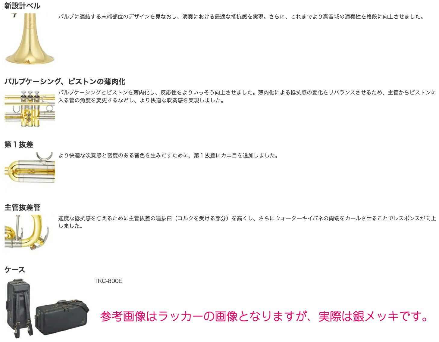 技術者調整品につき、基本的には出荷日の前日もしくは当日に調整して出荷を行っています。 ヤマハのトランペットはスタンダード、プロフェッショナル、カスタムと上位モデルになります。ヤマハのトランペットはかなり種類がありますが、アーティストモデルやジャズ向きなどといったものは演奏される楽曲やお好みにより近づけ、より個性的になるモデルになります。(以下おおよその価格順) ・スタンダード:一番安価であり小学生、中学生、などの吹奏楽導入に最適。 ・プロフェッショナル:上位モデルカスタムの系譜を受け継ぎ、1枚取りベルなど品質も一方上のモデルです。 ・カスタムシリーズ:あらゆる表現力を求めるのであればまずはカスタムから。カスタムの中にスタンダードなものと個性が輝くコンセプトモデルがあります。 ・カスタムシリーズ ゼノ:より個性的に確かな技術とアーティストの経験と技術が生かされた一歩上のシリーズ。 ・カスタムシリーズ ゼノアーティスト:各モデルのアーティストによるこだわりの仕様。Xeno(ゼノ)シリーズは、優れた楽器デザイナーや確かな技術を身にまとうクラフトマンシップ、世界を舞台に活躍するアーティストたちの経験、技術、そして夢が総合的に結実したシリーズです。力強く量感のあるサウンドと繊細な音楽表現を実現するための絶妙な抵抗感は、演奏者に新たなひらめきをもたらします。あなたの求める理想の音楽表現に応えるために、Xenoは奏者とともに進化し続けます。 ▼奏者が意図する音楽表現ができる楽器▼ 品質の高い楽器は音質と音量の幅が大きいですので奏者の意図する表現ができます。低価格帯の楽器は入れた息が音になりやすく吹きやすいことが重視されています。しかし上級者にとって、「吹きやすい」だけでは求める音質と音量は得られません。例えばとても小さな音を吹いた場合、ただ吹きやすい楽器では柔らかな小さな音のコントロールが難しいため段々と小さくできず、音がプツっと途切 れてしまった感じになります。また逆に大きい音を出すために息を沢山入れれば、楽器のキャパを越えてしまい綺麗な音色になりません。肺活量がコントロール できる上級者にとってはその息づかいがちゃんと表現できる精度の楽器が必要になります。入れた息をを跳ね返す力を抵抗といい、上級者にとっては適度な抵抗 感は大事なポイントです。高い楽器だから誰が吹いても良い音がでるわけではなく、良い音が鳴らせる可能性があるのです。同じ技量でも持つ楽器によって上手く演奏できるかどうか決まるかも。▼特徴▼・新設計ベル:バルブに連結する末端部位のデザインを見なおし、演奏における最適な抵抗感を実現。さらに、これまでより高音域の演奏性を格段に向上させました。・バルブケーシング、ピストンの薄肉化:バルブケーシングとピストンを薄肉化し、反応性をよりいっそう向上させました。薄肉化による抵抗感の変化をリバランスさせるため、主管からピストンに入る管の角度を変更するなどし、より快適な吹奏感を実現しました。・第1抜差:より快適な吹奏感と密度のある音色を生みだすために、第1抜差にカニ目を追加しました。・主管抜差管:適度な抵抗感を与えるために主管抜差の唾抜臼(コルクを受ける部分)を高くし、さらにウォーターキイバネの両端をカールさせることでレスポンスが向上しました。・ケース:リュック、ショルダー、手持ちができる3WAYタイプ。・1枚取りベル:一枚取りと二枚取りでは加工方法が異なるので吹奏感、音色に違いが出てきます。一枚取りはその名の通り、一枚の金属板(イチョウの葉のような形)を丸め、合わせ目を溶接して加工するもので、ベルの長手方向に一本の背骨をもったような構造になります。そのため、長手方向の振動が強調され、しっかりとした響きをもたらします。 二枚取りはベル先端のフレアと呼ばれる部分と胴部がちょうどベル彫刻付近で溶接されているもの。一般的に吹きやすく、明るい響きが得られます。・MLボア:ボアというのは、楽器に吹き込んだ空気が通る管の直径(内径)のこと。ボアのサイズによって息の量が決まり、音色が変わってくるのです。 ボアには、サイズの小さい順にミディアムボア(M)、ミディアムラージボア(ML)、ラージボア(L)があります。小さなものほど必要な息の量が少ないため吹きやすく、音色は繊細でしっとりとしたものになり、サイズが大きくなると息の量も多く必要となり、音色や音量ともに豊かで華やかなものとなります。・2本支柱:支柱はトランペットの音色や響きに重量感を加えるために立てられているパーツです。けれども、これを立てることによって、楽器を吹いたときの感触はかなり変わります。(支柱なし:明るく、抜けがよい。軽い音色。/支柱1本:豊かだが、ある程度の抵抗感。/支柱2本:かなりの抵抗感があり、重い音色。)・TR-16C4 マウスピース:カップ容量C、リム内径17.00mm、スロート径3.65mm、大きいリム内径と中庸な