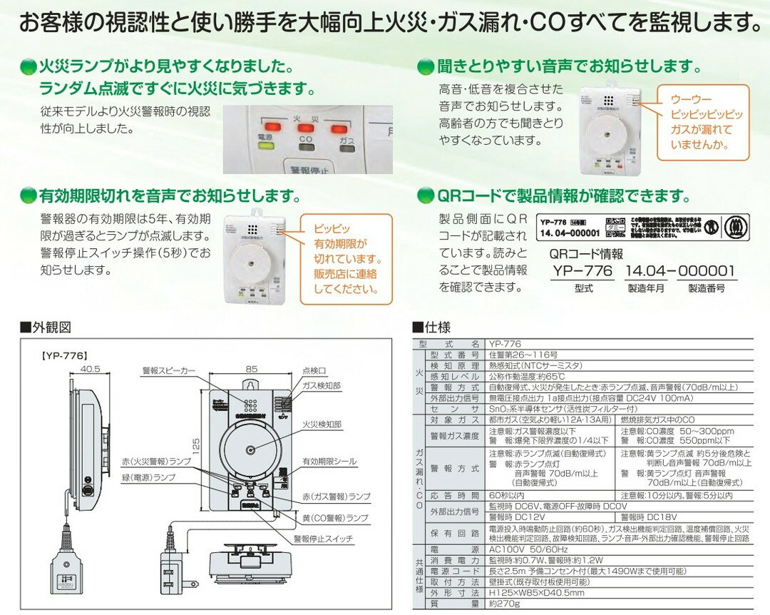 ■製品仕様製品型式YP-776 【火災】鑑定型式番号住警第26~116号 【火災】検知原理熱感知式(NTCサーミスタ) 【火災】感知レベル公称作動温度:約65℃ 【火災】警報方式自動復帰式、火災が発生したとき:赤ランプ点滅、音声警報(70dB/m以上) 【火災】外部出力信号無電圧接点出力1a接点出力(接点容量DC24V 100mA) 【ガスもれ・不完全燃焼】センサSnO2系半導体センサ(活性炭フィルター付) 【ガスもれ・不完全燃焼】対象ガス【ガスもれ】 都市ガス(空気より軽い12A・13A用) 【不完全燃焼】 燃焼排気ガス中のCO 【ガスもれ・不完全燃焼】警報ガス濃度【ガスもれ】 注意報:ガス警報濃度以下 警 報:爆発下限界濃度の1/4以下 【不完全燃焼】 注意報:CO濃度 50~300ppm 警 報:CO濃度 550ppm以下 【ガスもれ・不完全燃焼】警報方式【ガスもれ】 注意報:赤ランプ点滅(自動復帰式) 警 報:赤ランプ点灯 音声警報 70dB/m以上(自動復帰式) 【不完全燃焼】 注意報:黄ランプ点滅 約5分後危険と判断し音声警報 70dB/m以上 警 報:黄ランプ点灯 音声警報 70dB/m以上(自動復帰式) 【ガスもれ・不完全燃焼】応答時間【ガスもれ】 60秒以内 【不完全燃焼】 注意報:10分以内 警報:5分以内 【ガスもれ・不完全燃焼】外部出力信号監視時 DV6V、電源OFF・故障時 DC0V 【ガスもれ】 警報時 DC12V 【不完全燃焼】 警報時 DV18V 【ガスもれ・不完全燃焼】保有回路●電源投入時鳴動防止回路(約60秒) ●ガス検出機能判定回路 ●温度補償回路 ●火災検出機能判定回路 ●故障検知回路 ●ランプ・音声・外部出力確認機能 ●警報停止回路 【共通仕様】電源AC100V 50/60Hz 【共通仕様】消費電力監視時:約0.7W 警報時:約1.2W 【共通仕様】電源コ ー ド長さ2.5m 予備コンセント付(最大1490Wまで使用可能) 【共通仕様】取付方法壁掛式(既存取付板使用可能) 【共通仕様】外形寸法H125×W85×D40.5mm 【共通仕様】質量約270g ※仕様は予告なく変更する場合がございますので、予めご了承下さい。 こちらの商品は、ご使用いただける期限が定められておりますのでご注意ください。 当店では、商品の品質を保持するため製造後2年以内の商品のみ販売しております。 こちらの商品のご使用いただける期間は、設置後5年となります。 おすすめ警報器はこちら LPガス警報器 YF-005N LPガス警報器 YF-005N(D) LPガス警報器 YF-005NV LPガス警報器 APH-40N(L) LPガス警報器 CF-626 LPガス警報器 YF-417C 都市ガス警報器 YF-814 都市ガス警報器 YP-756F 都市ガス警報器 YP-774 都市ガス警報器 YP-776 都市ガス警報器 YP-778A CO検知器 YZ-165C